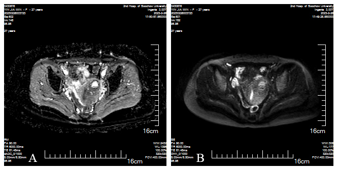 Fig. 4. March 2, dADC (D-1), DWI (D-2) showed low signal intensity on the left side of the uterus. (A) dADC and (B) DWI both confirm low signal intensity on the left side of the uterus, with fluid present within this lesion, a possibility of gestational sac rupture and bleeding is suggested.