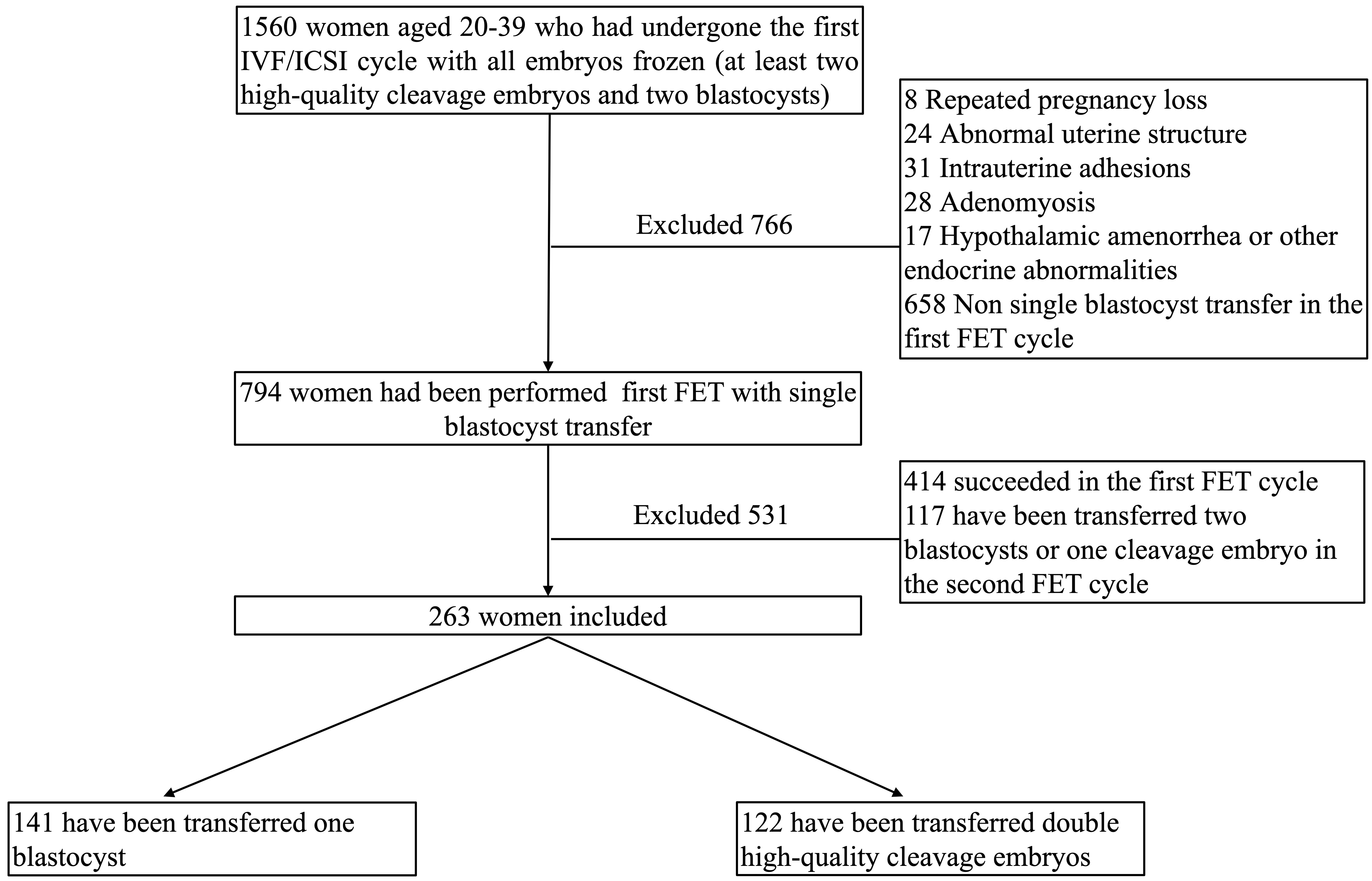 A total of 263 infertile women met the above criteria. Among them, 141 patients underwent transfer of one blastocyst, while 122 patients underwent transfer of two cleavage-stage embryos in the second FET cycle. This study was conducted in accordance with the principles of the Declaration of Helsinki. A waiver of informed consent was obtained for this study because it did not disclose any personal or identifying patient information and posed no risk to the participants. Approval was granted by the Research Ethics Committee of Peking University Shenzhen Hospital(approval number: 2024-133).
