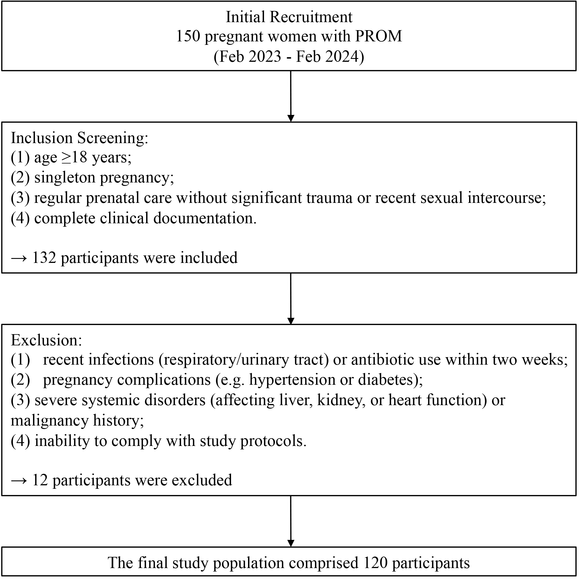 This prospective study enrolled 150 pregnant women diagnosed with PROM according to the 2015 Guidelines for Diagnosis and Management of PROM [18] from Chongqing University Central Hospital and the People’s Hospital of Yubei District between February 2023 and February 2024. Initial screening identified 132 eligible participants meeting all inclusion criteria: (1) age