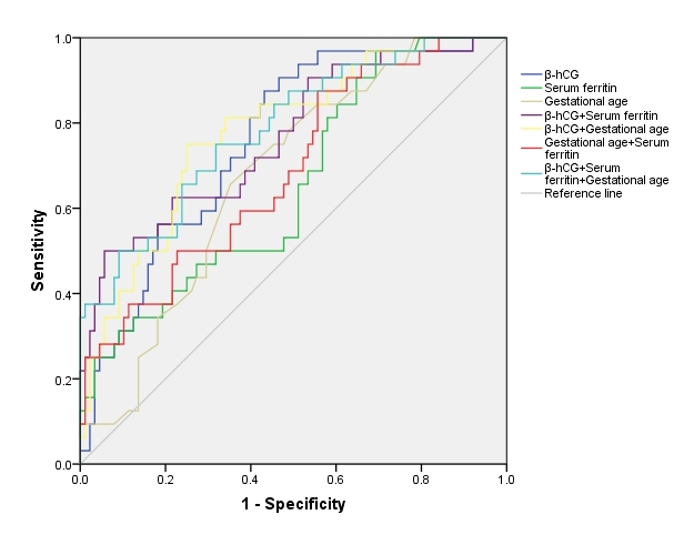 This was a prospective study involving 120 patients with PROM, including 32 cases diagnosed with intrauterine infection and 88 non-infected controls. Parameters such as serum beta-human chorionic gonadotropin (β-hCG), serum ferritin (SF), and gestational age (GA) were evaluated for their diagnostic efficacy using logistic regression and receiver operating characteristic (ROC) analysis.