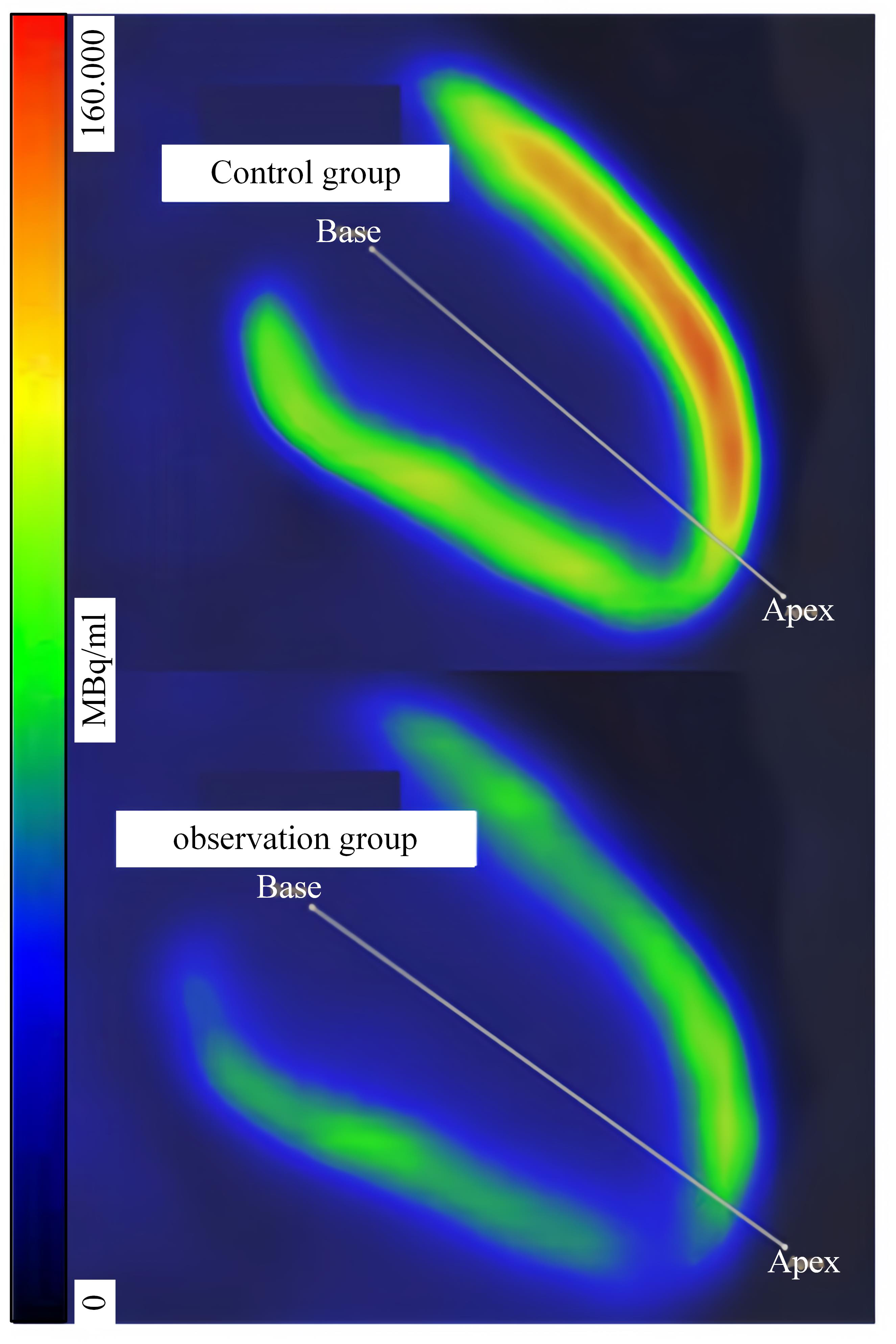 Cardiac blood flow and metabolic status were assessed by PET. Cardiac blood flow was measured using oxygen-15 labeled water as a tracer, with an intravenous injection dose of 600 MBq. Imaging typically began immediately after injection and lasted for approximately 10 minutes. The pharmacokinetic analysis of cardiac blood flow was performed using a dual tissue compartment model, which was calibrated using arterial input functions for calculation. The myocardial glucose uptake was evaluated using 18F fluorodeoxyglucose and quantitatively analyzed using standardized uptake values. The intravenous injection dose was 3.7 MBq/kg, and a waiting time of 60 minutes was required after injection to allow the tracer to be taken up in the myocardium. The imaging time was usually 30 minutes. The myocardial fatty acid uptake was measured using carbon-11 palmitic acid as a tracer, with an intravenous injection dose of 380 MBq and a typical imaging time of 15–20 minutes. The analysis of myocardial fatty acid uptake used a single tissue compartment model to calculate inflow and outflow rates. The metabolic correction was applied to the input function to eliminate the interference of tracer metabolites in the blood. Myocardial metabolic efficiency was determined by calculating the ratio of the heart’s work output to energy expenditure.