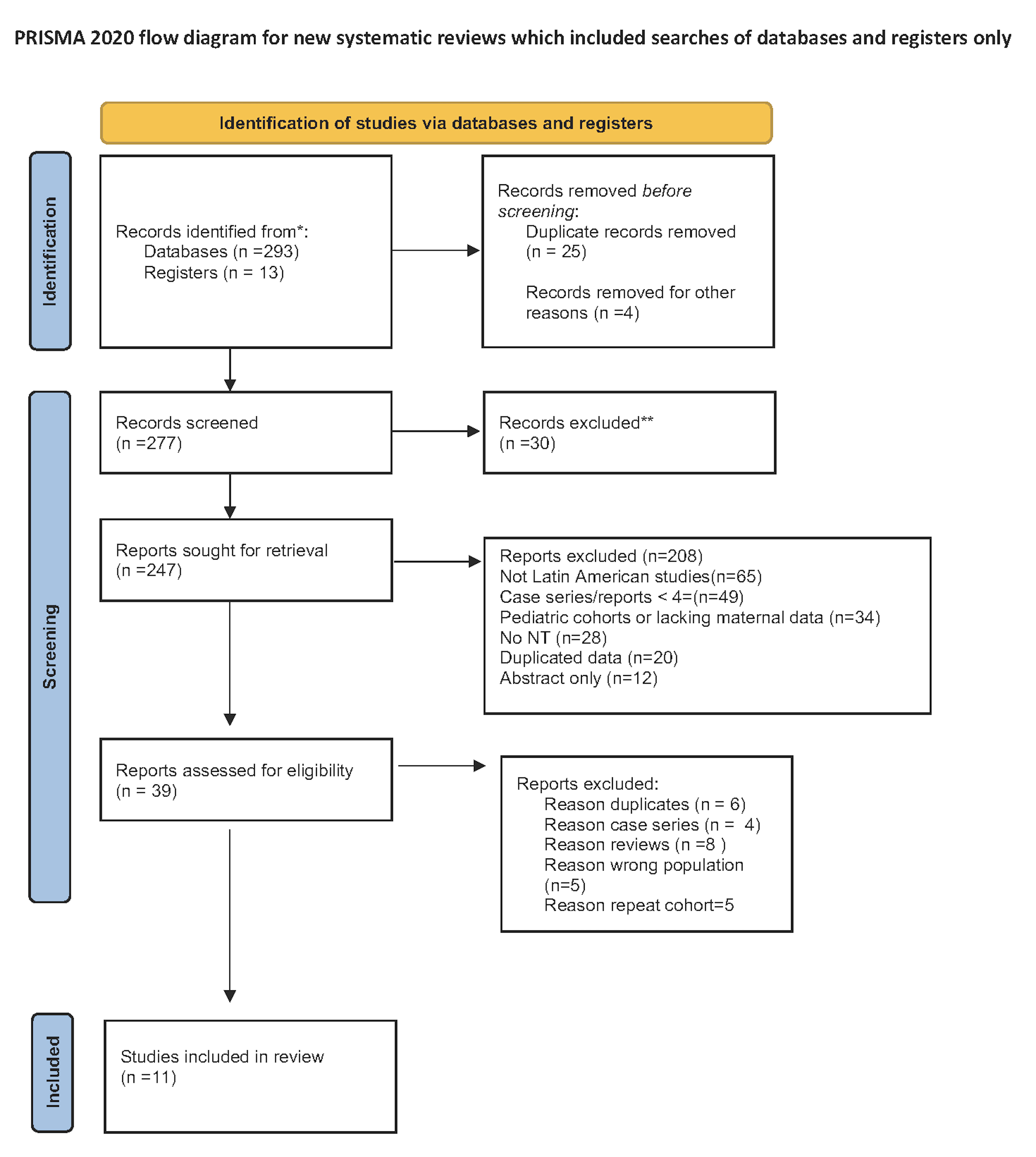 The present systematic literature search identified 306 citations related to increased NT, genetic testing, and chromosomal anomalies in Latin America. After removing duplicates, 39 full-text studies were assessed, of which 11 met the inclusion criteria Fig. 2 (Ref. [14]). Collectively, these 11 studies included 842 fetuses with increased NT. Among them, nine studies applied the fetal medicine foundation (FMF) guidelines and NT measurements to evaluate the risk of Down syndrome and other aneuploidies [11, 17, 18, 19, 20, 21, 22, 23, 24]. One study used maternal age as the sole screening criterion [25], while another employed the “Fetal Test” software for risk assessment [22].
