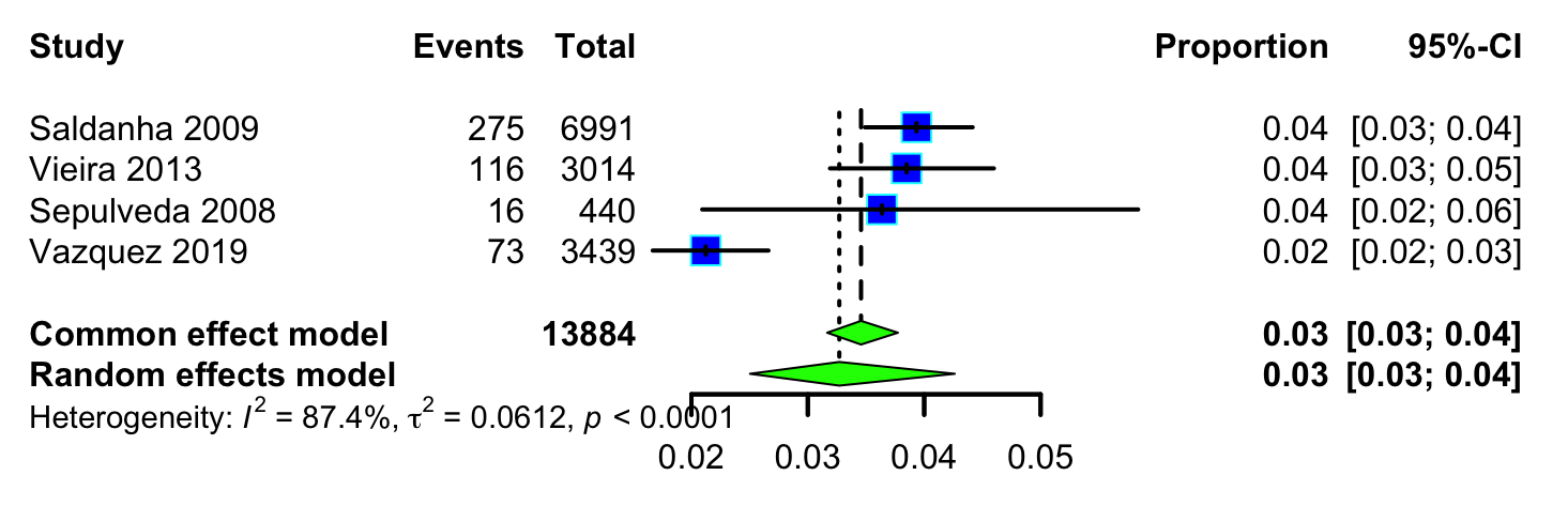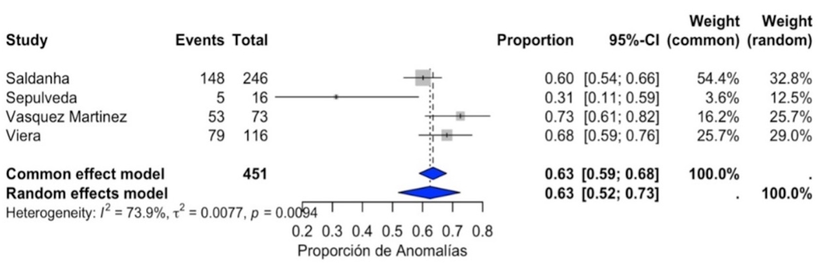 The pooled proportion of cardiac anomalies was estimated to be 0.42 (95% CI: 0.1–0.73). The proportion of cardiac anomalies varied across studies, with Saldanha et al. (2009) [18] reporting 2.4%, Vieira et al. (2013) [19] reporting 7.0%, and the Panamanian cohort reporting 0.36%. The random effects model was used to account for heterogeneity, yielding a conservative estimate.