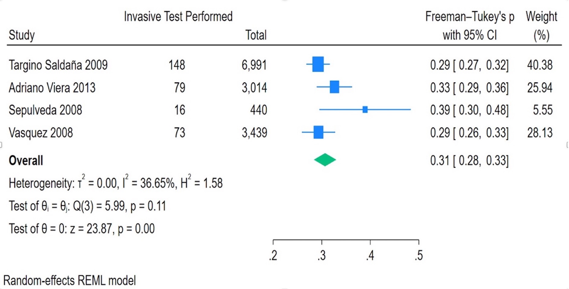 Fig. 4 presents a forest plot of the proportion of fetuses undergoing invasive testing. The pooled proportion of invasive testing was 0.31 (95% CI: 0.28–0.33), with individual study estimates ranging from 0.29 to 0.39. Heterogeneity was moderate (I2 = 36.65%), with a non-significant Q-test (p = 0.11), indicating that the variability across studies was not statistically significant.