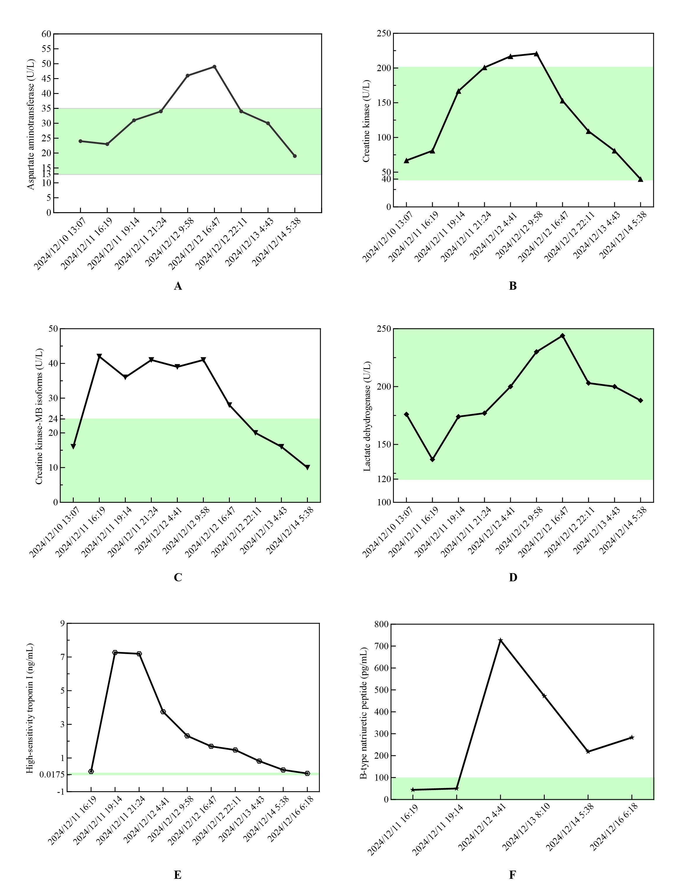 Results of the blood test of indicators. (A) Aspartate aminotransferase. (B) Creatine kinase. (C) Creatine kinase-MB isoforms. (D) Lactate dehydrogenase. (E) High-sensitivity troponin I. (F) B-type natriuretic peptide.