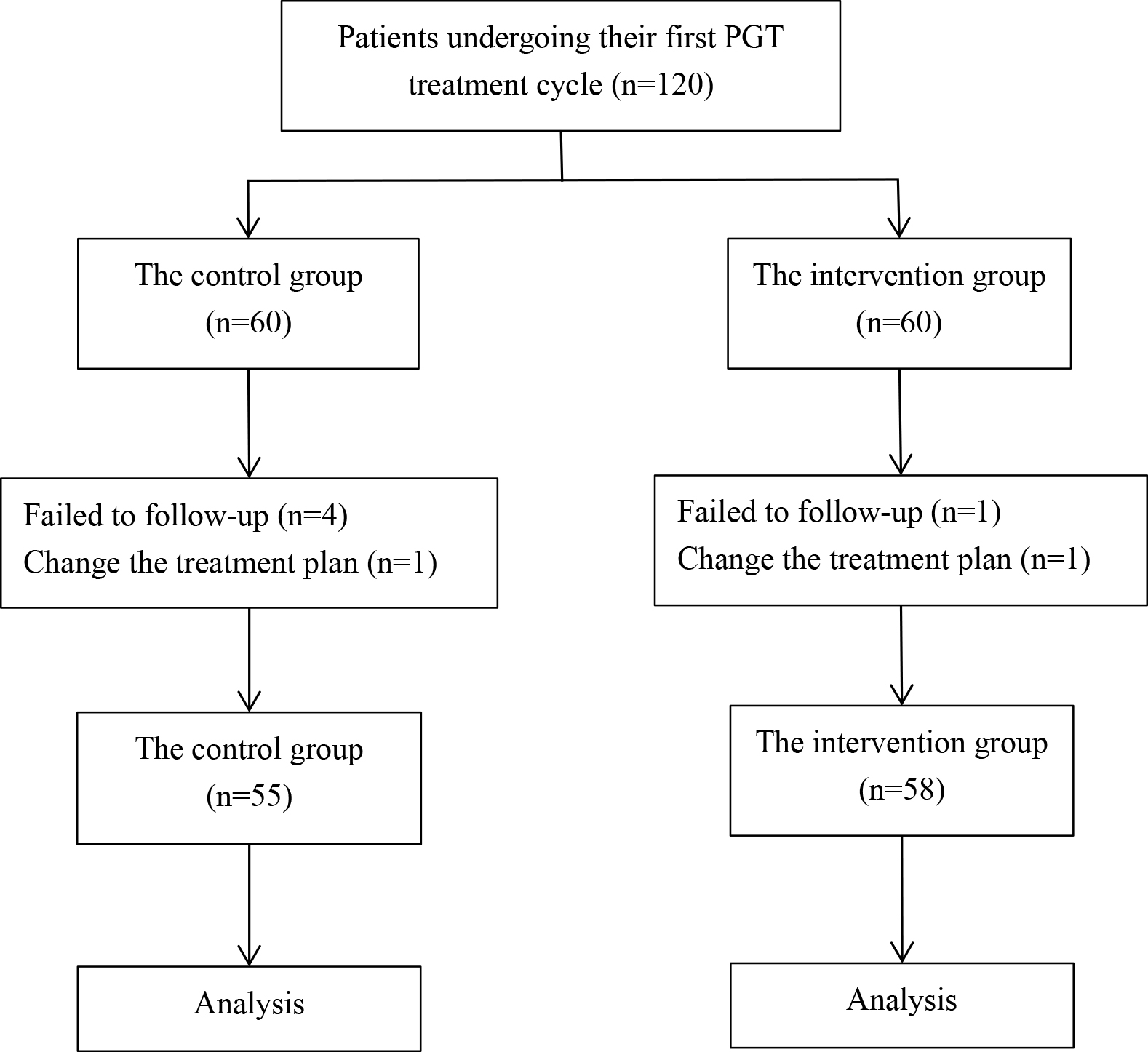 A total of 120 patients undergoing PGT for the first time at our reproductive center from 5 March 2022 to 31 October 2022 were randomly divided into the control and intervention groups. The control group received routine health education, and the intervention group received family-centered group health education. The knowledge of PGT, satisfaction with health education, along with anxiety and social support levels, were compared between the two groups before and after the intervention. The differences were statistically significant at p < 0.05.