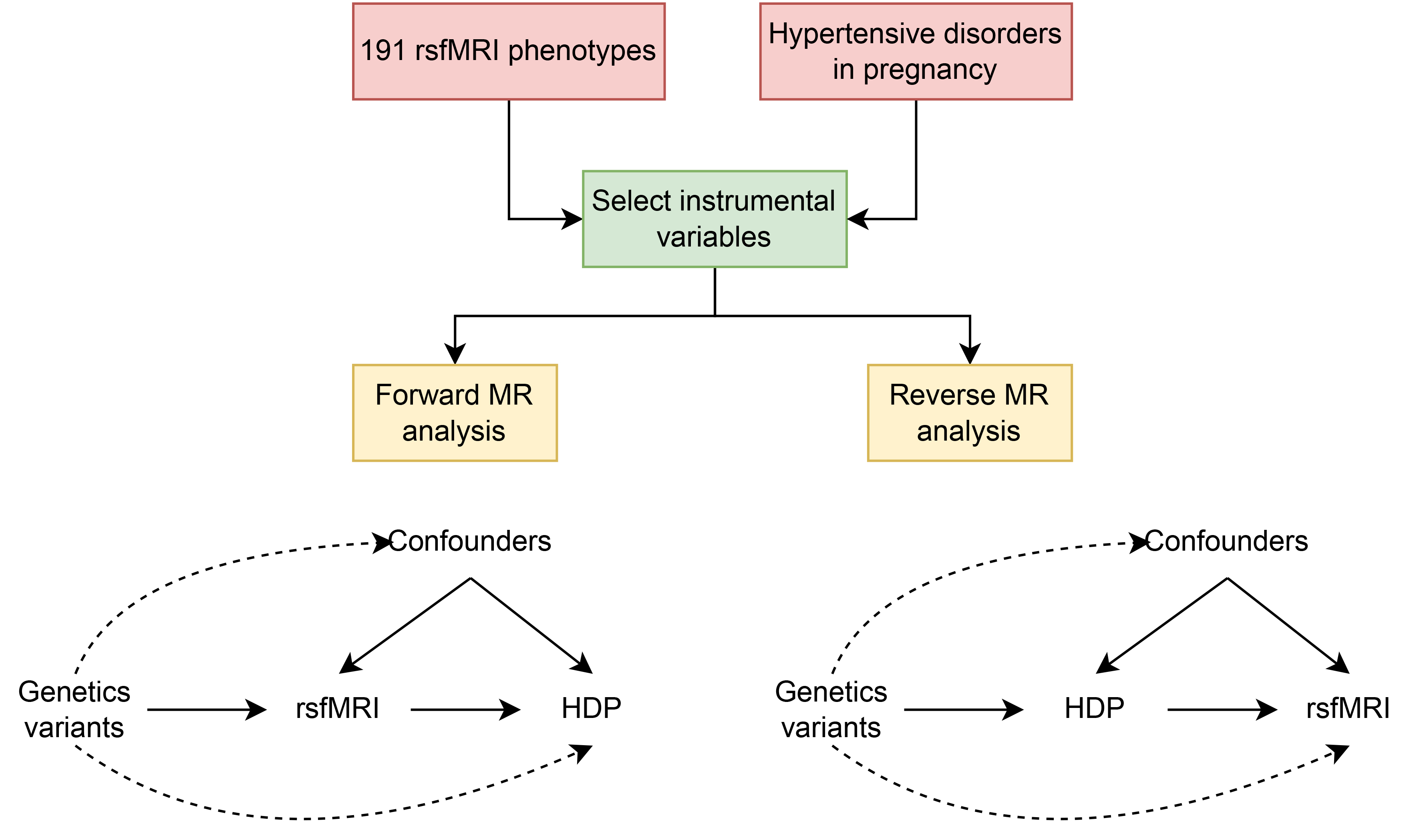 A bidirectional two-sample Mendelian randomization (MR) framework was applied to estimate the causal effects of 191 resting-state functional magnetic resonance imaging (rsfMRI) phenotypes (sample size: 34,691) on five HDPs, and vice versa. The five HDP conditions were gestational hypertension (GH), pre-eclampsia (PE), eclampsia, chronic hypertension, and PE superimposed on chronic hypertension.