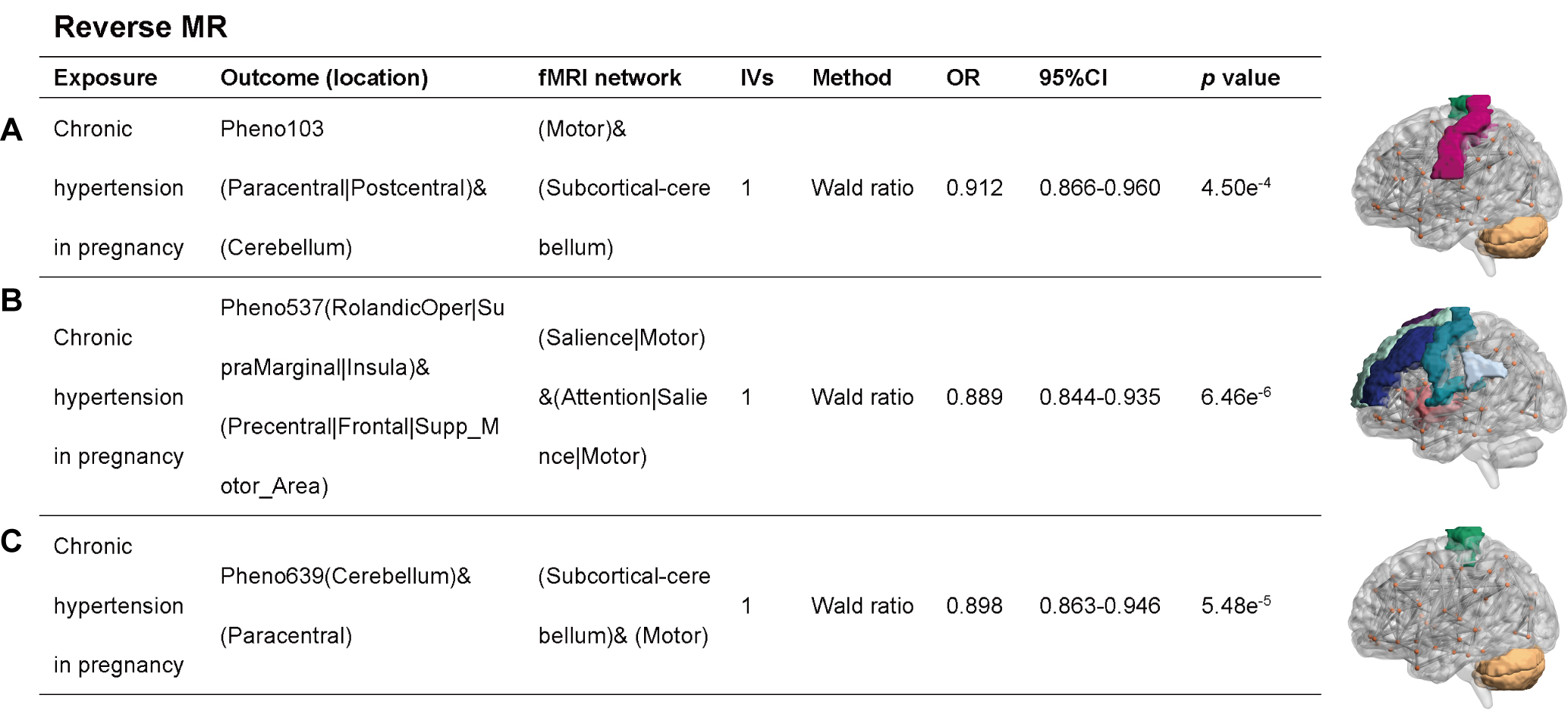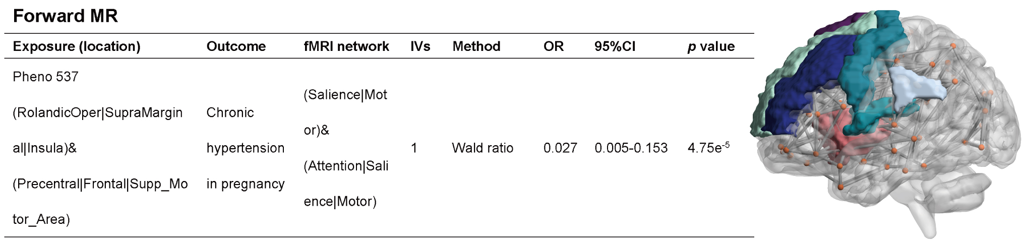 Forward MR estimates identified a potential causal relationship between one rsfMRI phenotype (attention, salience, and motor network) and chronic hypertension in pregnancy. The MR analysis of the reverse direction revealed that chronic hypertension in pregnancy may exert a causal influence on three rsfMRI phenotypes: the motor and subcortical-cerebellum network, the attention, salience, and motor network, and the subcortical–cerebellum and motor network. The causal relationship between the attention, salience, and the motor network and chronic hypertension in pregnancy was found to be bidirectional.