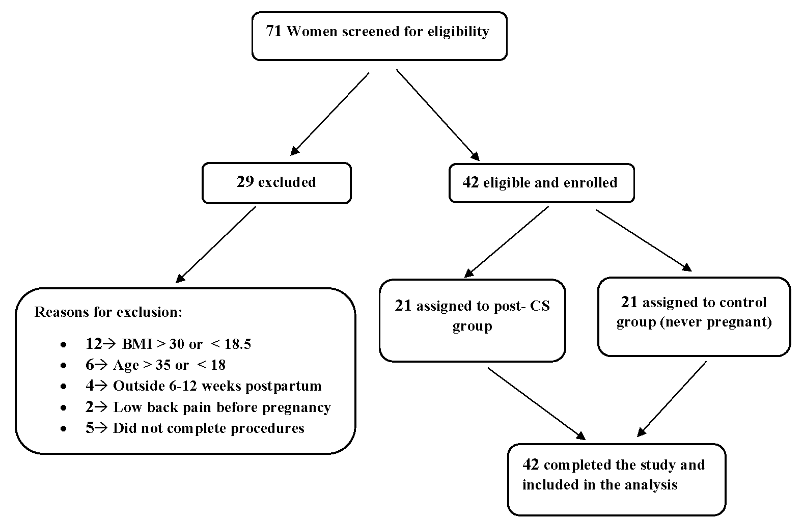 A total of 71 women were screened for eligibility. Of these, 29 were excluded: 12 had a BMI greater than 30 kg/m2 or less than 18.5 kg/m2, 6 were older than 35 or younger than 18 years, 4 were outside the window of 6–12 weeks postpartum, 2 were experiencing specific low back pain before pregnancy, and 5 did not complete all required procedures. The remaining 42 women met the eligibility criteria and were enrolled in the study. 21 women were assigned to the post-CS group and 21 to the control group (never pregnant). All enrolled participants completed the study and were included in the final analysis (Fig. 2).