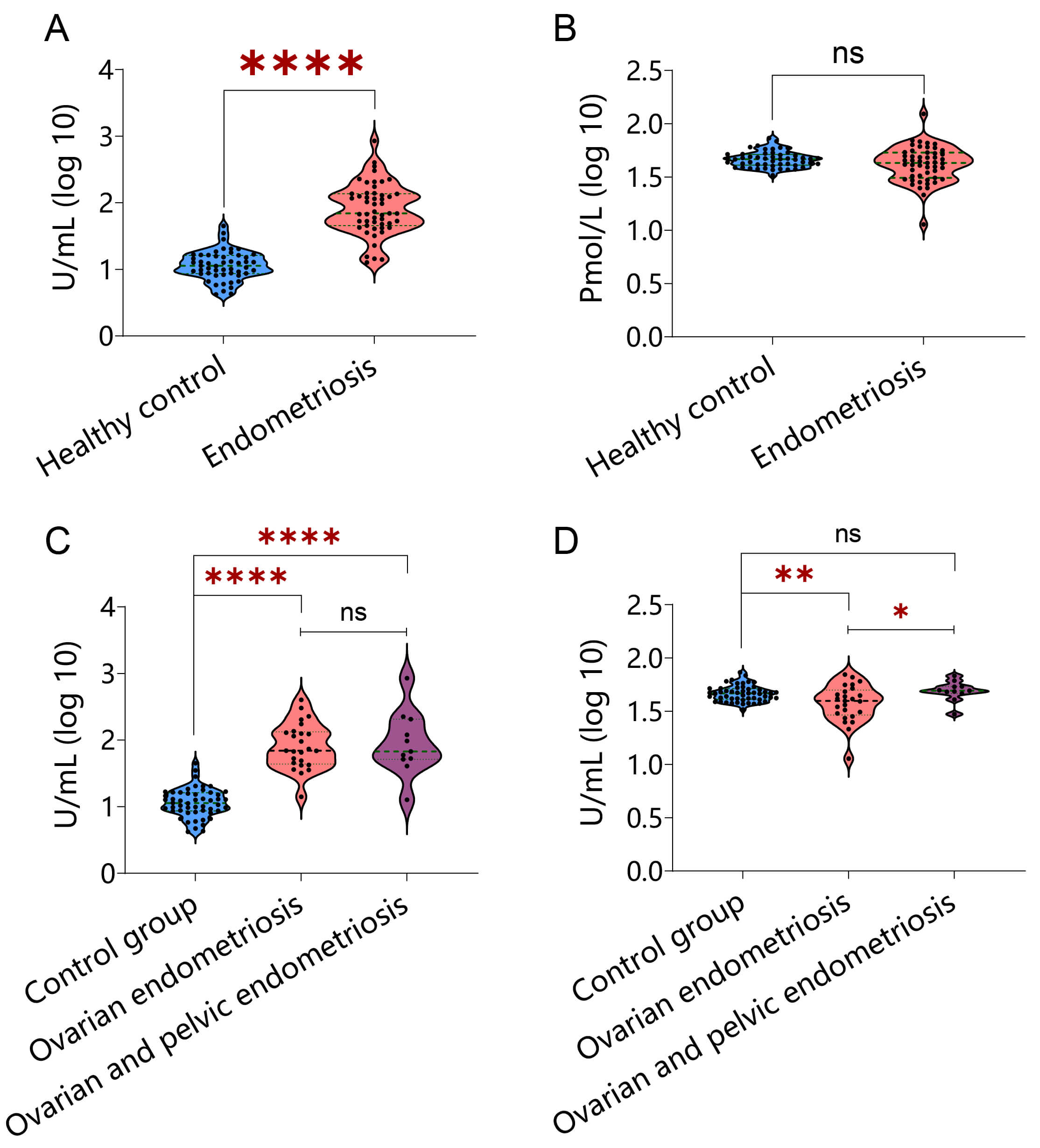 controls versus endometriosis patients. (C) CA125 levels across study groups: