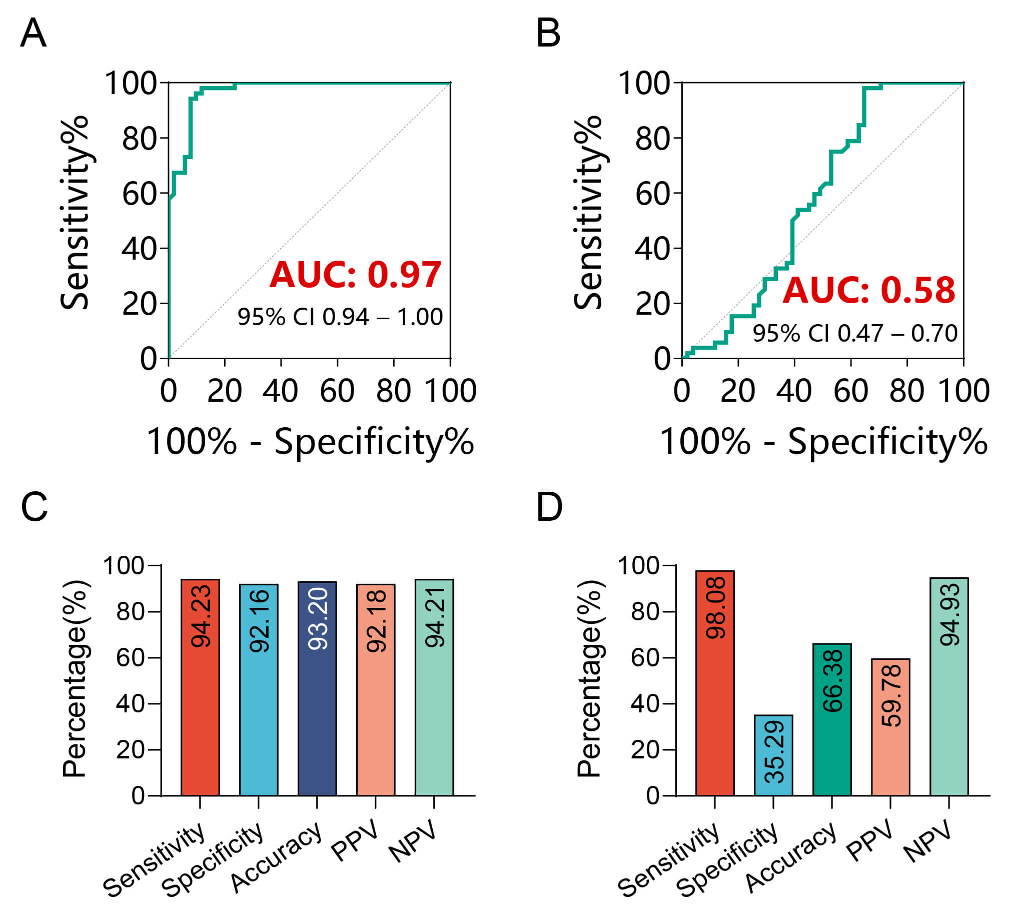 Analysis of the diagnostic value of CA125 and HE4 for endometriosis. (A) ROC curve analysis of the diagnostic performance of CA125 for endometriosis. (B) ROC curve analysis of the diagnostic performance of HE4 for endometriosis. (C) Sensitivity, specificity, and accuracy of diagnosing endometriosis through CA125. (D) Sensitivity, specificity, and accuracy of diagnosing endometriosis through HE4. AUC, area under the curve; 95% CI, 95% confidence interval; PPV, positive predictive value; NPV, negative predictive value; ROC, receiver operating characteristic.