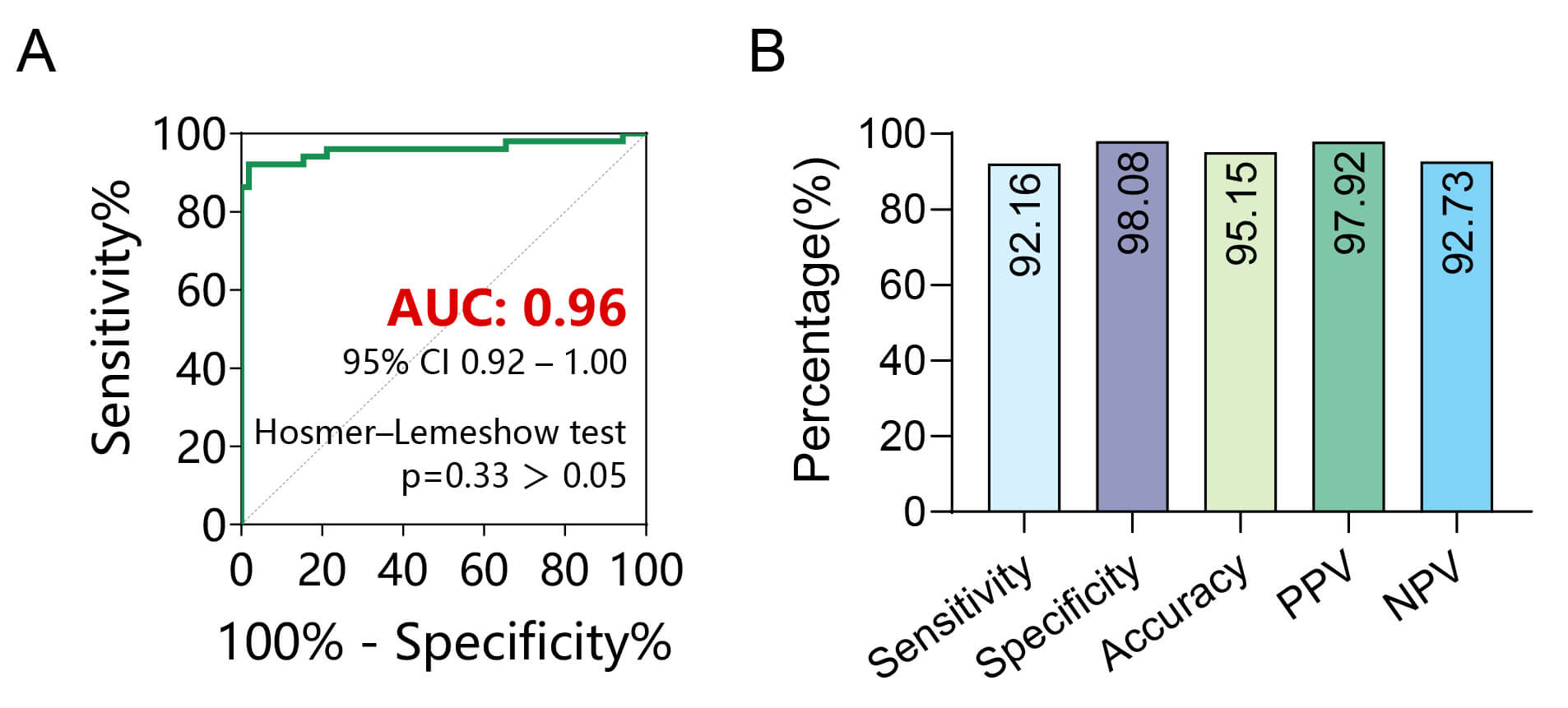 To achieve this goal, we used logistic regression model to combine the numerical values of CA125 and ultrasound detection results to establish a combined diagnostic model and evaluated its diagnostic performance by drawing ROC curves (Fig. 5A, Table 6). The results showed that the AUC of the ROC curve for the combined diagnostic model was 0.96 (95% CI: 0.92–1.00), indicating that it has high accuracy in distinguishing patients with endometriosis from non-patients. Further analysis through the maximum Youden index showed that the sensitivity, specificity, accuracy, PPV, and NPV of the combined diagnostic model were 92.16% (95% CI: 0.85–1.00), 98.08% (95% CI: 0.94–1.01), 95.15% (95% CI: 0.91–1.00), 97.92% (95% CI: 0.94–1.02), and 92.73% (95% CI: 0.86–1.00), respectively. These metrics indicate that the model can not only effectively identify true patients (high sensitivity) but also accurately exclude non-patients (high specificity), with high overall diagnostic accuracy.