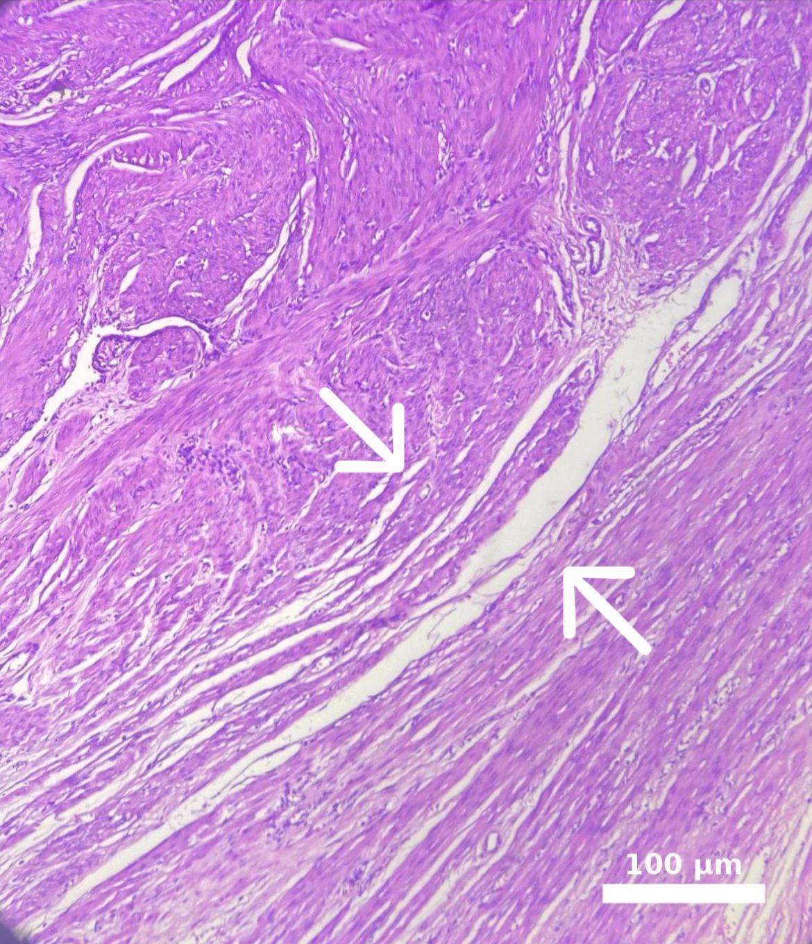 Fig. 3. Microscopic appearance of intramural myoma. The white line marked with a white arrow in the image delineates the border between the leiomyoma and the adjacent myometrium. Endometrioma tissue is visible on the left side. The myometrium in the lower right corner appears distorted due to pressure, while an intramural myoma is observed in the upper left corner. Scale bar: 100 μm (H&E, hematoxylin and eosin,