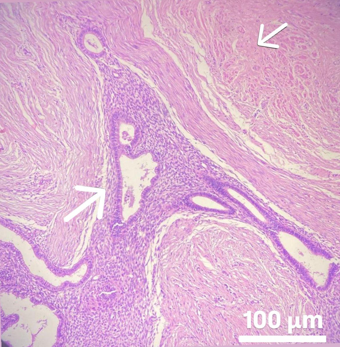 Fig. 5. Microscopic appearance of abdominal wall endometrioma. Arrows indicate ectopic endometrial tissue with preserved gland and stroma integrity within striated muscle and connective tissue. The rectus muscle is located in the upper right corner, while the abdominal wall endometrioma is visible in the lower left corner. Scale bar: 100 μm (H&E, hemtoxylin and eosin,