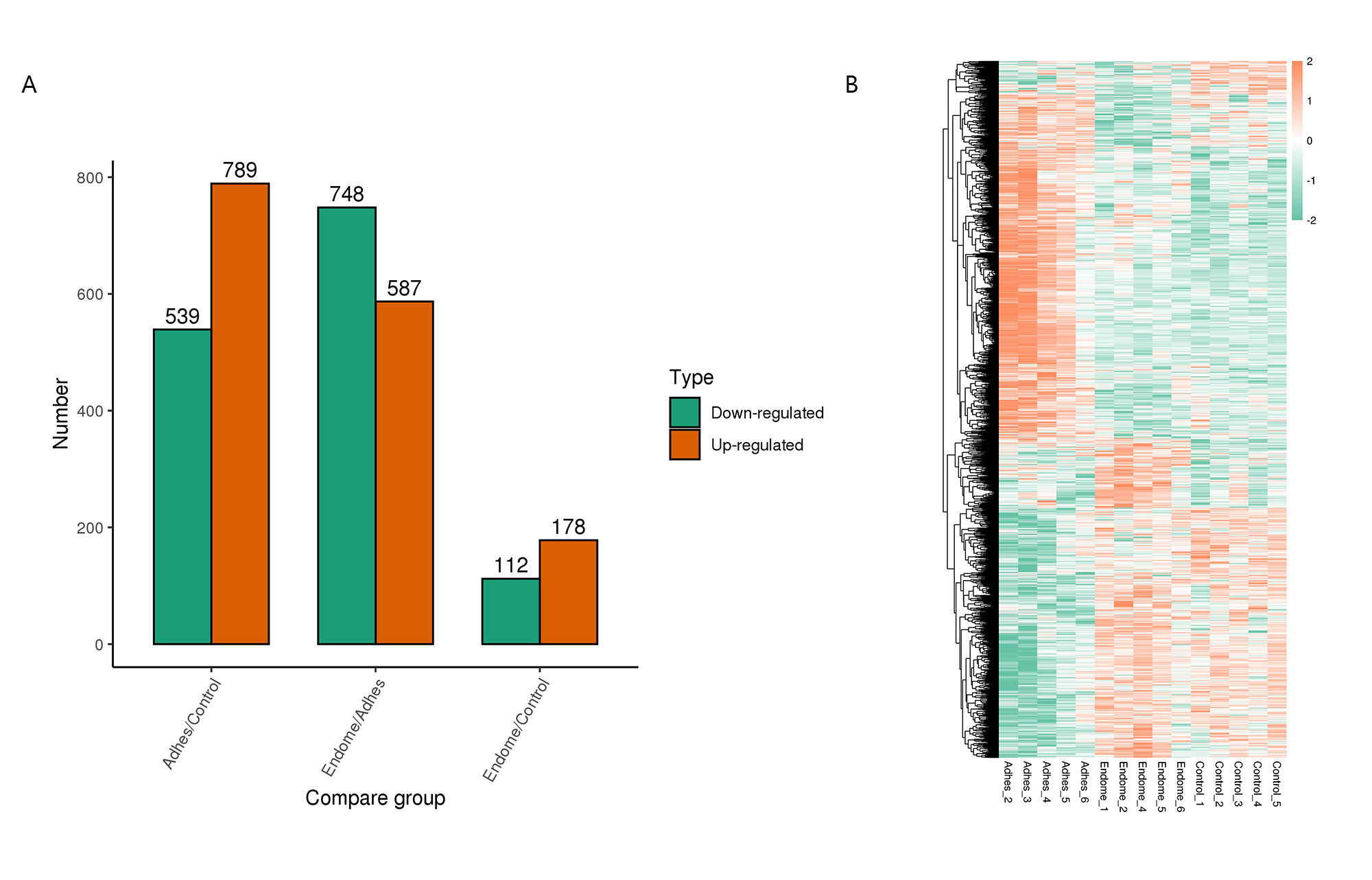 We selected 5 patients with IUA confirmed by hysteroscopic examination, who were admitted to the Changzhou Maternity and Child Health Care Hospital from March 2022 to September 2022, aged 20–40, who were fertile, and had not taken any estrogen-progestogen hormones within the 6 months prior to sampling and 5 patients who could provide normal endometrial tissue due to uterine fibroids (the presence of intramural or subserous fibroids would not affect the endometrium). The endometrial adhesion tissue of IUA patients was selected as Adhes group, the endometrial tissue 2 cm away from the adhesion tissue was selected as Endome group, and the endometrial tissue of uterine fibroids patients was selected as Control group. We performed pairwise comparisons, divided into three comparison groups: Adhes/Control, Endome/Control, Adhes/Endome group. All specimens were collected 3–7 days after menstruation and confirmed by pathological examination. The study was approved by the Ethics Committee of Changzhou Maternity and Child Health Care Hospital (approval number 2021[88]); Patients were informed and enrolled after obtaining consent and signing written informed consent. Patients with connective tissue diseases, endometrial diseases and endocrine diseases were excluded. All patients underwent routine examinations before surgery, and age, Body Mass Index (BMI), and Hemoglobin (Hb) were recorded. The collected specimens were stored in a –80 ℃ freezer.