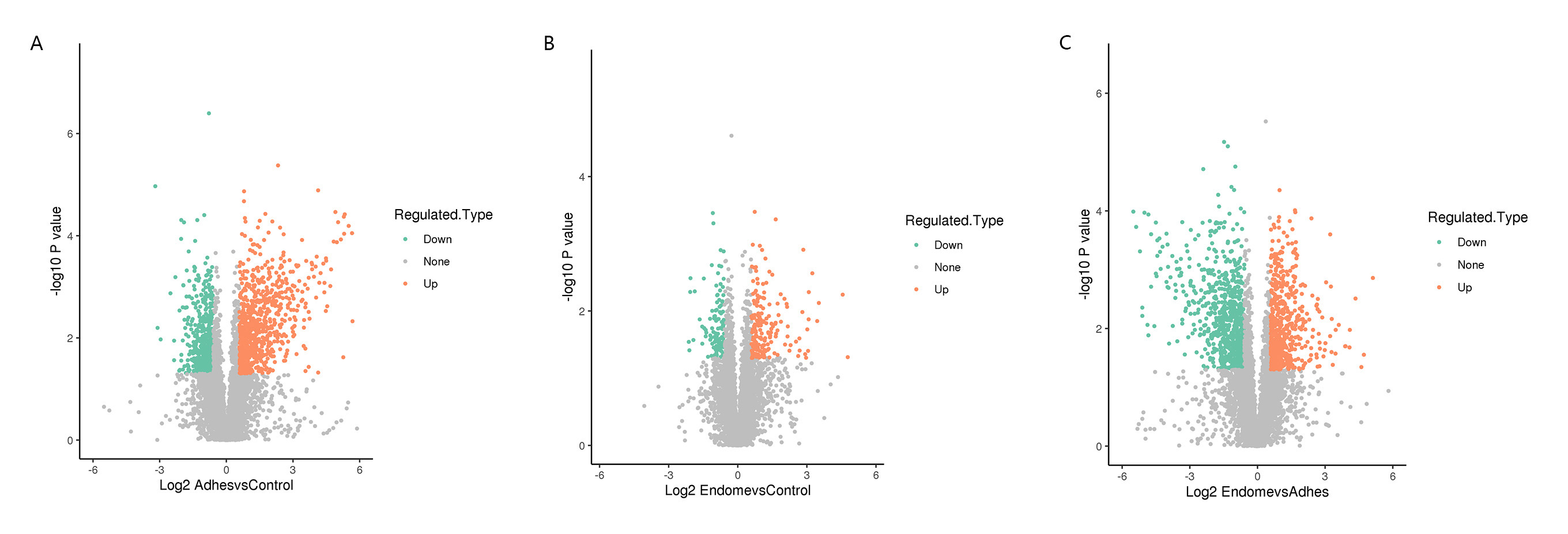 Fig. 2. The volcano plot of the DEPs among three comparison groups. Down-regulated proteins were labeled green, and the orange dots represented up-regulated proteins. The gray dots represented proteins with no significant differences. (A) Volcano plot of DEPs in Adhes/Control group. (B) Volcano plot of DEPs in Endome/Control group. (C) Volcano plot of DEPs in Endome/Adhes group.