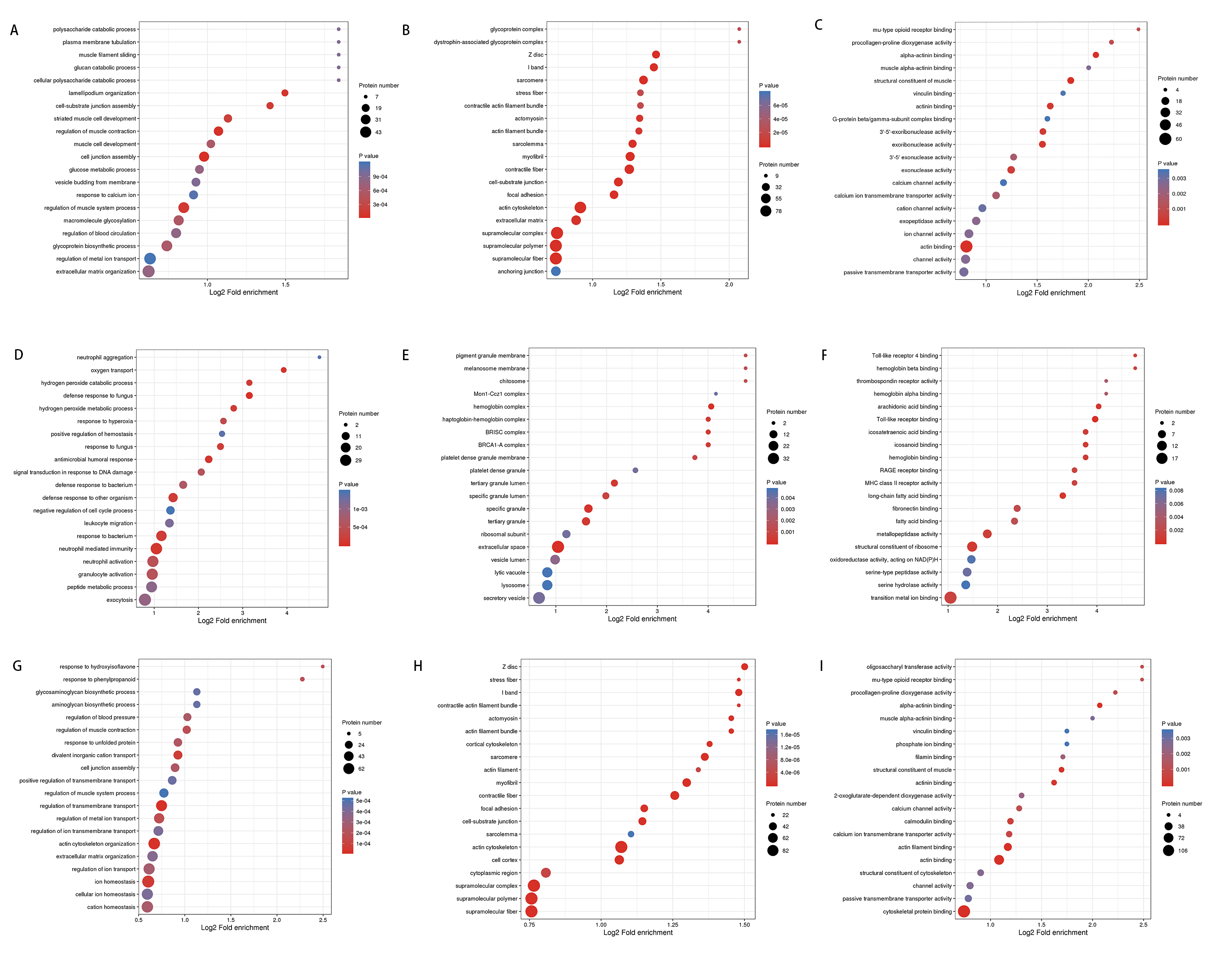 Fig. 3. The bubble chart of the gene ontology (GO) enrichment analysis of DEPs in each compare group. The color of the circle represents the p-value, and the size of the circle represents the number of DEPs. (A) Enrichment analysis of biological processes in Adhes/Control group. (B) Enrichment analysis of Cell component in Adhes/Control group. (C) Enrichment analysis of Molecular function in Adhes/Control group. (D) Enrichment analysis of biological processes in Endome/Control group. (E) Enrichment analysis of Cell component in Endome/Control group. (F) Enrichment analysis of Molecular function in Endome/Control group. (G) Enrichment analysis of biological processes in Endome/Adhes group. (H) Enrichment analysis of Cell component in Endome/Adhes group. (I) Enrichment analysis of Molecular function in Endome/Adhes group.