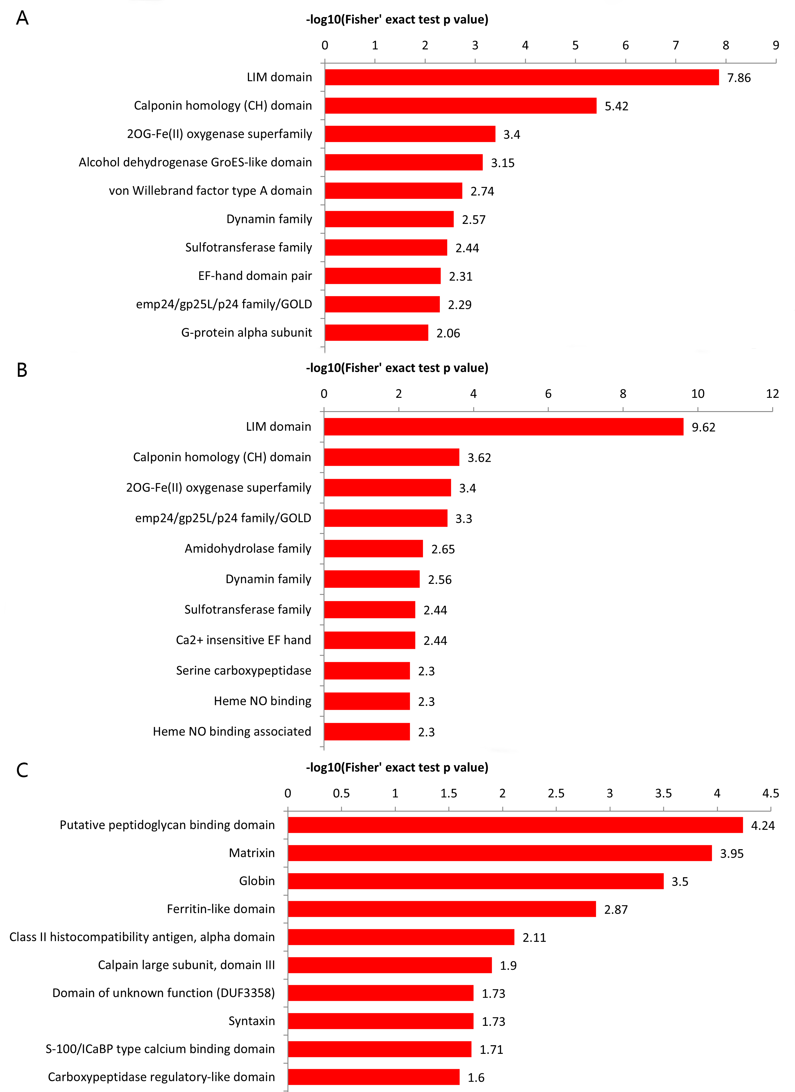 Fig. 4. The top 10 protein domain enrichment analysis of DEPs. (A) Protein domain enrichment analysis of Adhes/Control group. (B) Protein domain enrichment analysis of Endome/Adhes group. (C) Protein domain enrichment analysis of Endome/Control group.