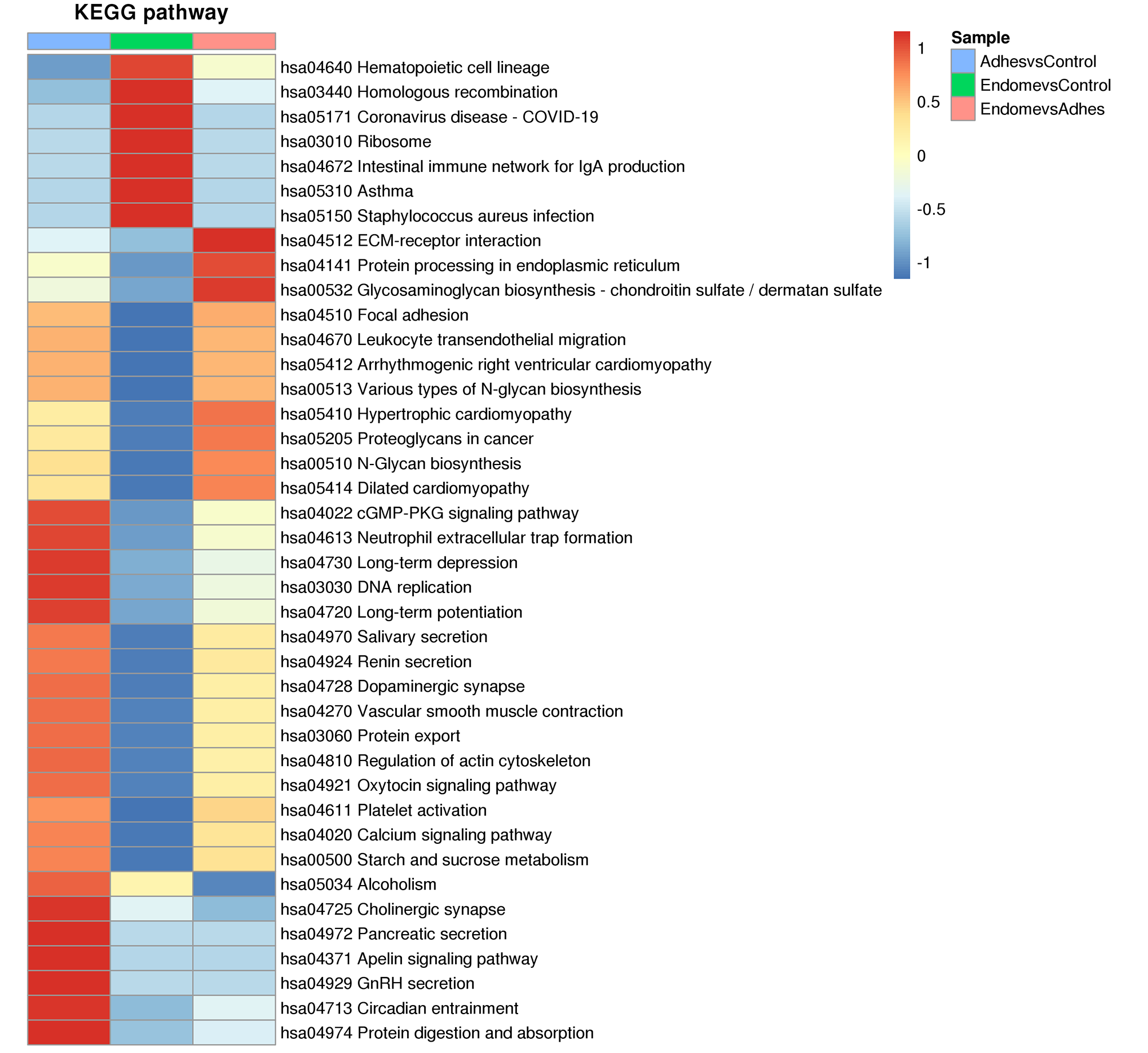 We performed cluster analysis of KEGG pathways after enriched analysis to discover the metabolic pathways, biochemical reactions, and signal transduction processes. A cross-sectional comparison of the three groups found that the DEPs had multiple similar KEGG enrichment pathways between the Adhes/Control and the Endome/Adhes groups. In addition to the above focal adhesion, the DEPs was also enriched in regulation of actin cytoskeleton, the cGMP-PKG signaling pathway and the oxytocin signaling pathway. For the Adhes/Control group, the central pathways were the apelin signaling pathway, vascular smooth muscle contraction, and cholinergic synapse. ECM-receptor interaction and protein processing in endoplasmic reticulum were found to be enriched in most proteins of the Endome/Adhes group. The Endome/Control group primarily functioned in the staphylococcus aureus infection, hematopoietic cell lineage and homologous recombination (Fig. 5).