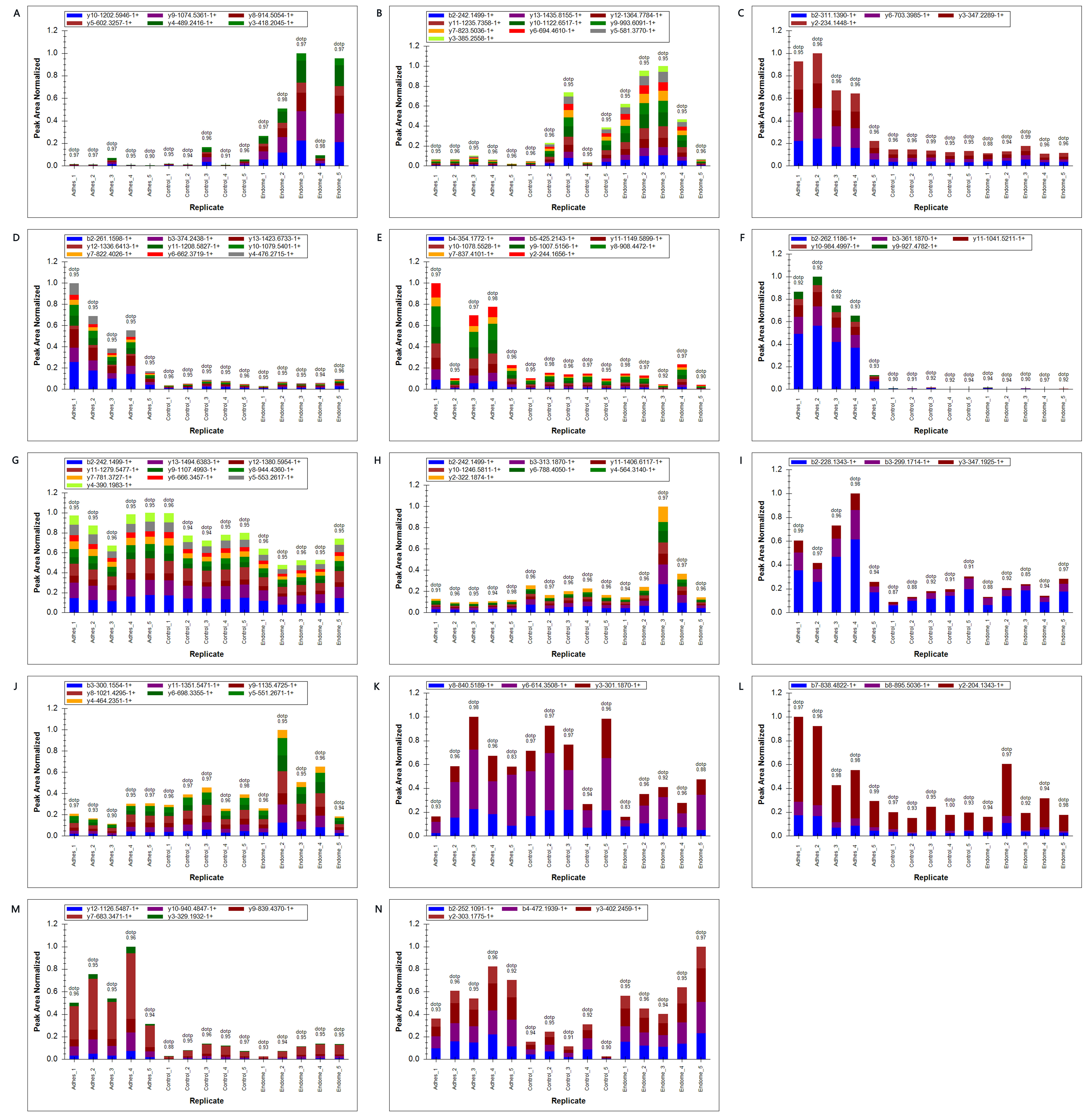 To verify the above proteomic data results, we selected DEPs with lower p-values and higher enrichment multiples, and many specific peptide segments, which are also functional proteins or transcription factors, but do not include cytoskeletal proteins, to pick up to 20 target proteins. Subsequently, 1–2 specific peptide segments were selected to quantify the 20 target proteins using the method of fragment ion peak area. Finally, 14 proteins were successfully detected and quantified (ADIPOQ, ABHD6, CAMK2G, IRAG1, MYLK, SYNPO2, PTPN11, PROS1, SLC4A1, TGFB1, HLA-DRB3, COQ6) (Table 2) through the peak area. The rest of the data is available in Fig. 6. These target proteins were with high fold change and low p-value and most of them have significant enrichment in certain KEGG pathways. The results are in high agreement with those of LFQ proteomics, which appear to serve as reliable confirmations of protein changes.