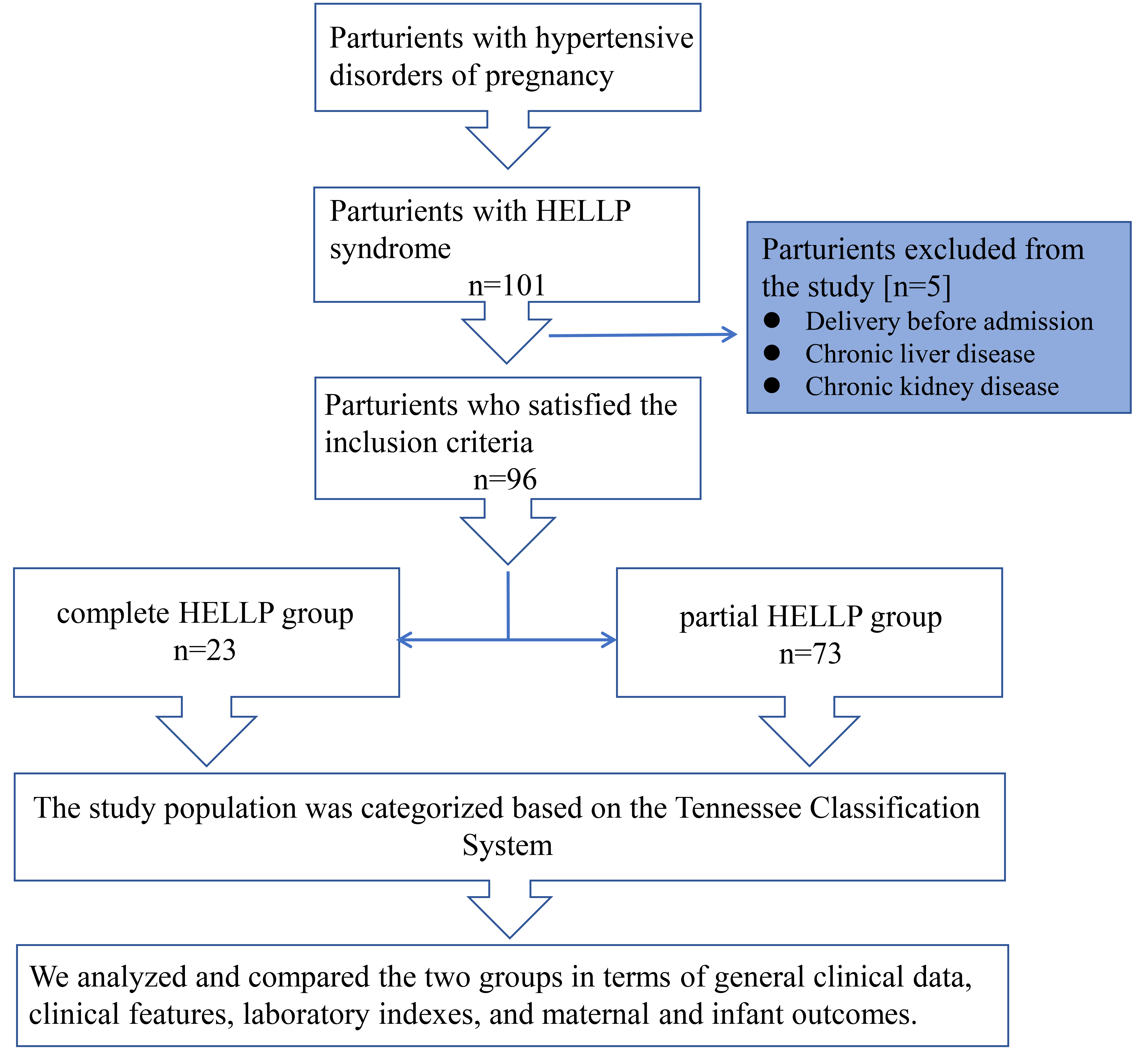 Ninety-six patients with HELLP syndrome were retrospectively enrolled from January 2016 to December 2023. HELLP syndrome was diagnosed using the Tennessee Classification System, which is globally recognized. This system includes the following laboratory findings: (1) hemolysis, defined by abnormal peripheral smear, elevated bilirubin (