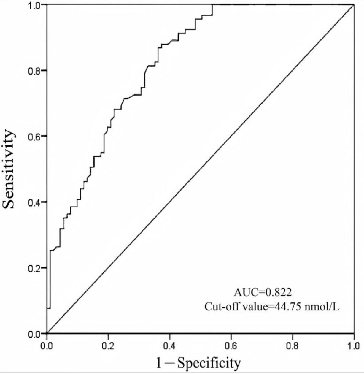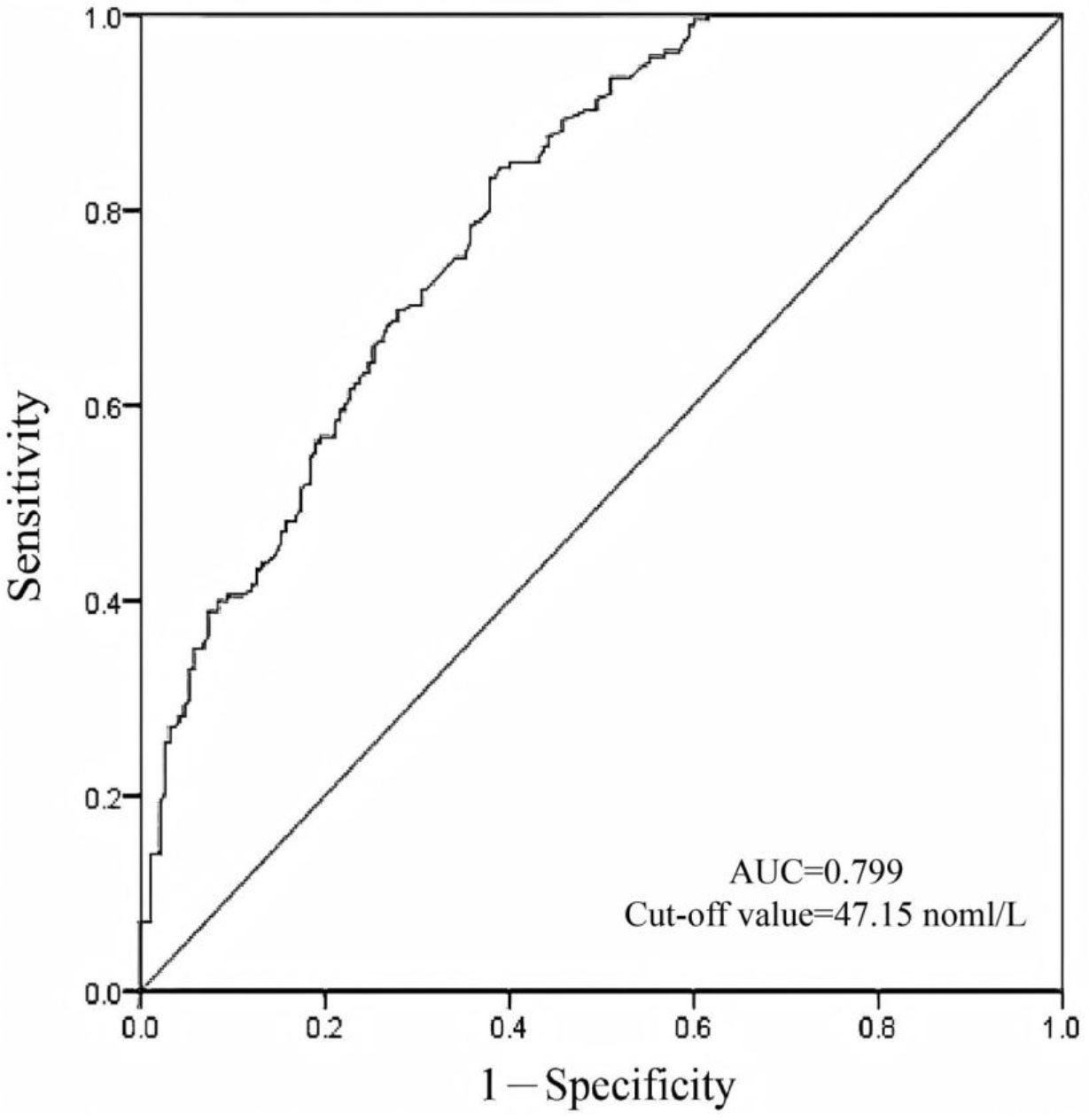 Fig. 2. Diagnostic value of vitamin D for adenomyosis in unmatched patients. The optimal cut-off value of the vitamin D is 47.15 nmol/L.