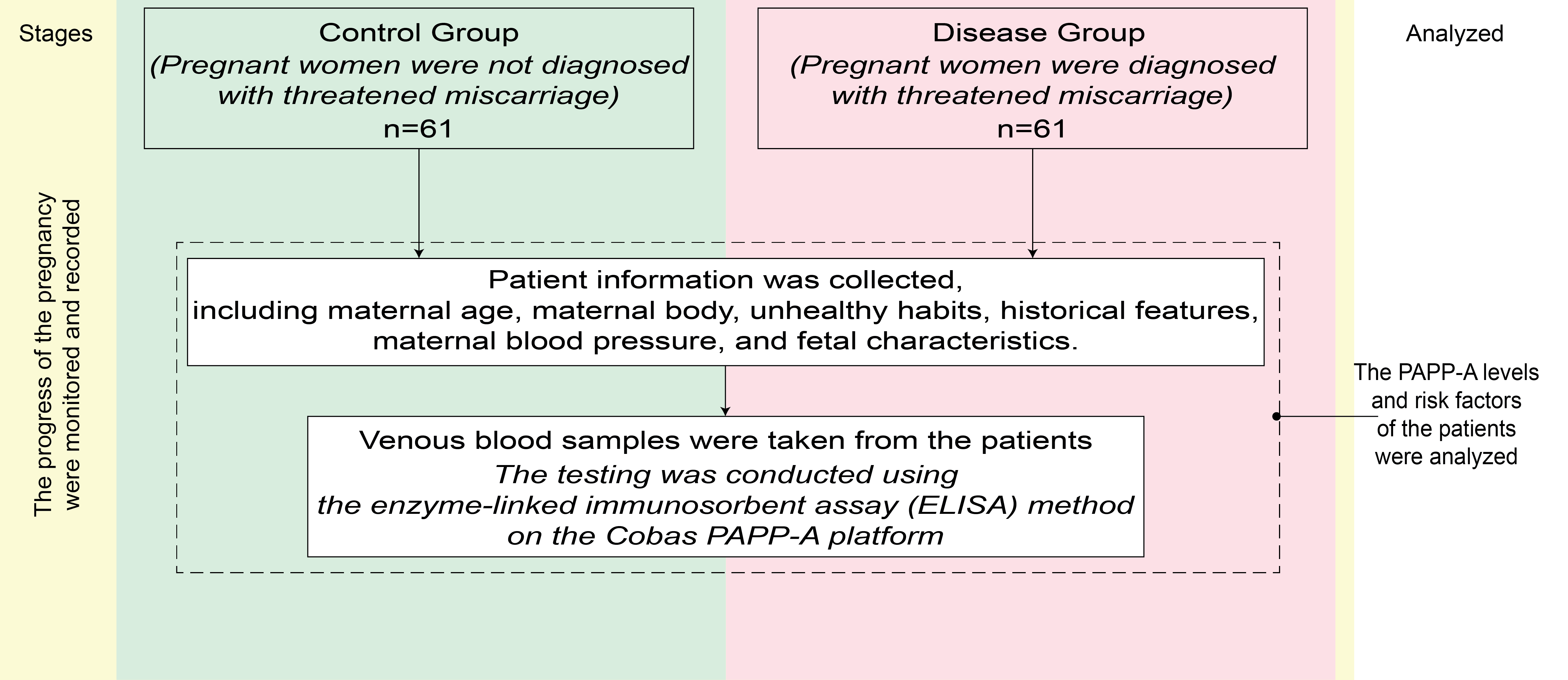 We conducted a retrospective case-control study from June 2020 to December 2020, involving 122 patients: 61 pregnant women with threatened miscarriage (disease group) and 61 healthy pregnant women (control group). All participants were at gestational age of 11–14 weeks. Pregnant women were selected according to specific diagnostic criteria for threatened miscarriage, regardless of any prior bleeding. The two groups were interviewed to collect data on age, number of pregnancies, body mass index (BMI), risk factors for miscarriage, blood pressure, fetal heart rate, and other relevant parameters. Participants also underwent clinical examinations, including ultrasound scans, non-invasive prenatal testing, and rubella antibody testing. Maternal venous blood samples for PAPP-A quantification were collected at 11–14 gestational weeks.