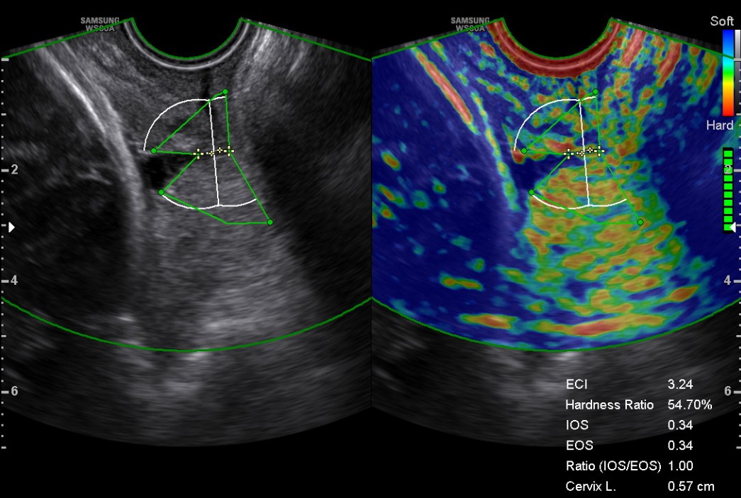 The use of transvaginal ultrasound to measure several parameters has been investigated as an alternative to the cervical Bishop score to predict the success rate of induced labor. We analyzed the utility of the cervical Bishop score and cervical elastography ultrasound parameters in assessing cervical ripeness after 39 weeks gestation.