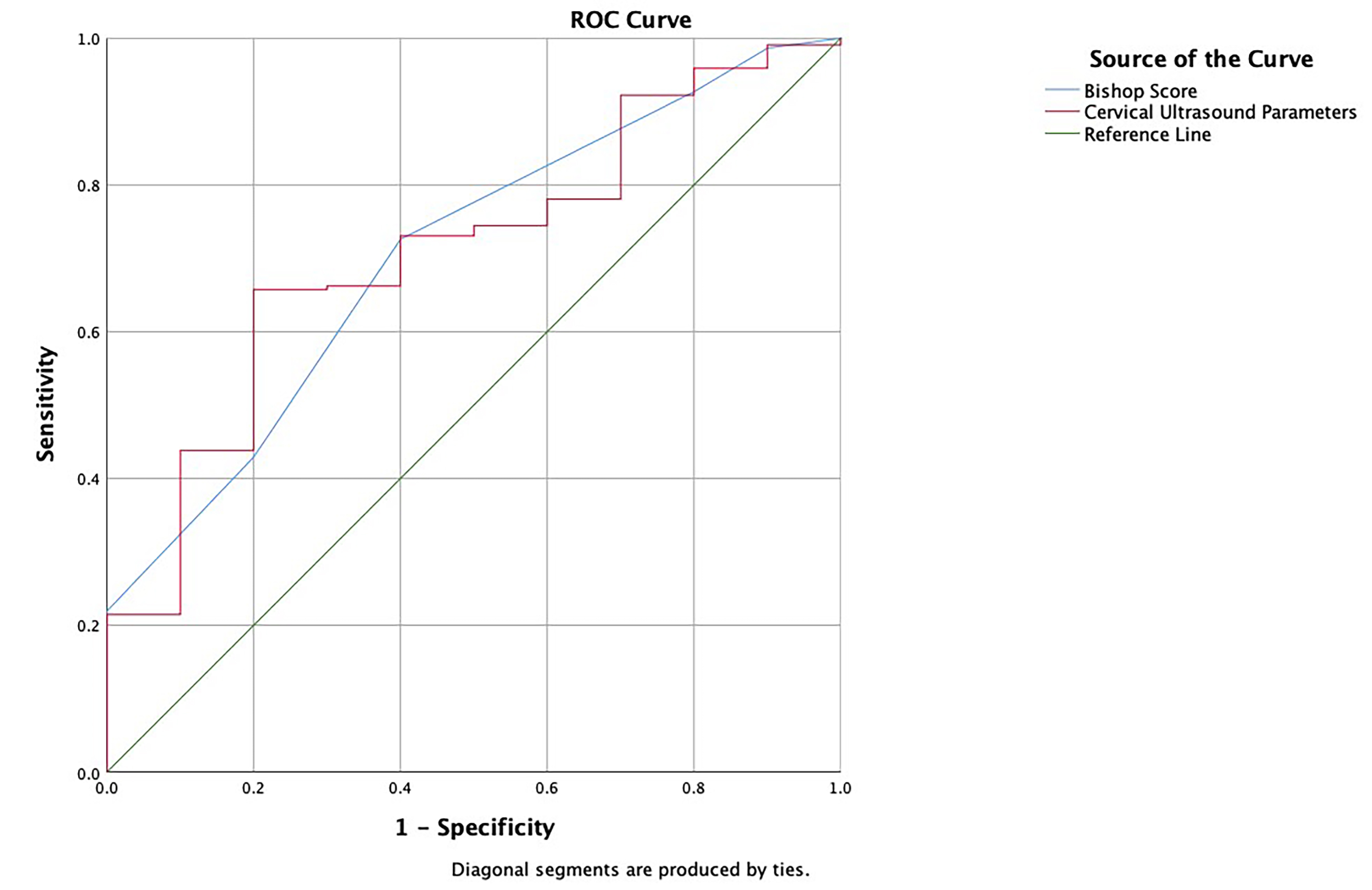 As illustrated in Table 4 and Fig. 2, the area under the ROC curve for the cervical Bishop score in assessing cervical ripeness was found to be 0.706. In comparison, the area under the ROC curve for cervical length, cervical hardness, internal cervical os shape, cervical transverse width, and the IOS/EOS ratio as parameters of cervical elastography ultrasound was 0.710. However, this difference is not statistically significant.