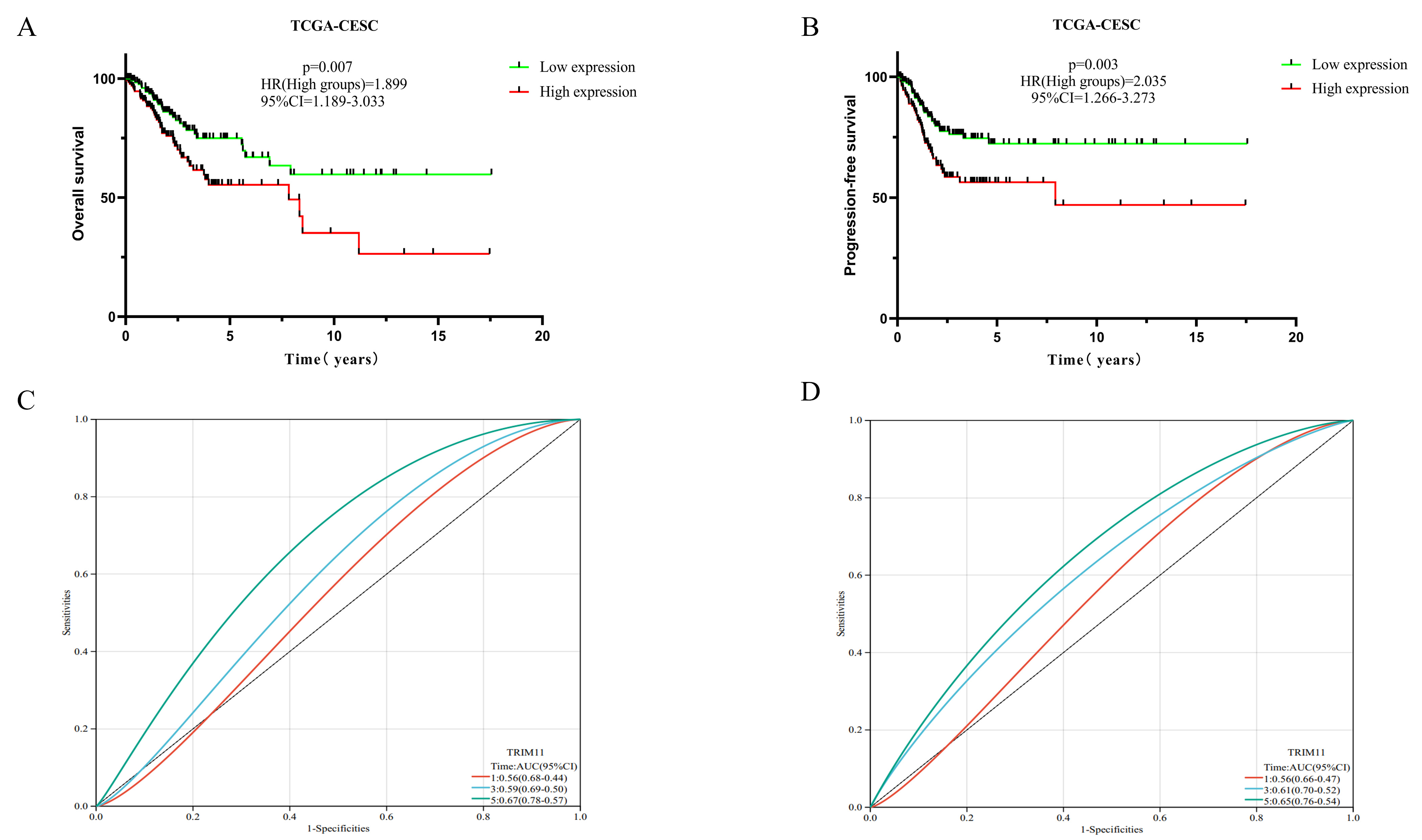 In the TCGA-CESC dataset, OS and progression-free survival (PFS) were significantly longer in patients with CC in the low-TRIM11-expression group than in those in the high-TRIM11-expression group (p = 0.007, HR = 1.899, 95% CI [1.189–3.033] and p = 0.003, HR = 2.035, 95% CI [1.266–3.273]; Fig. 3A,B). The area under the receiver operating characteristic (ROC) curve (AUC) at 1, 3, and 5 years was 0.56 (p = 0.048, 95% CI, 0.44–0.68), 0.59 (p = 0.035, 95% CI, 0.50–0.69), and 0.67 (p = 0.012, 95% CI, 0.57–0.78) for OS, respectively, and 0.56 (p = 0.041, 95% CI, 0.47–0.66), 0.61 (p = 0.031, 95% CI, 0.52–0.70), and 0.65 (p = 0.022, 95% CI, 0.54–0.76) for PFS, respectively (Fig. 3C,D).