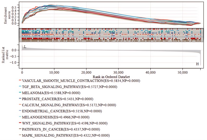 GSEA in the TCGA-CESC dataset showed that TRIM11 was significantly associated with various gene sets (Fig. 4), including Vascular-Smooth-Muscle-Contraction (enrichment score (ES) = 0.5834, nominal p-value (NP) = 0.0000), Tgf-Beta-Signaling-Pathway (ES = 0.5727, NP = 0.0000), Melanoma (ES = 0.5588, NP = 0.0000), Prostate-Cancer (ES = 0.5431, NP = 0.0000), Calcium-Signaling-Pathway (ES = 0.5172, NP = 0.0000), Endometrial-Cancer (ES = 0.5158, NP = 0.0000), Melanogenesis (ES = 0.4966, NP = 0.0000), WNT-Signaling-Pathway (ES = 0.4598, NP = 0.0000), Pathways-In-Cancer (ES = 0.4337, NP = 0.0000), and MAPK-Signaling-Pathway (ES = 0.4322, NP = 0.0000).