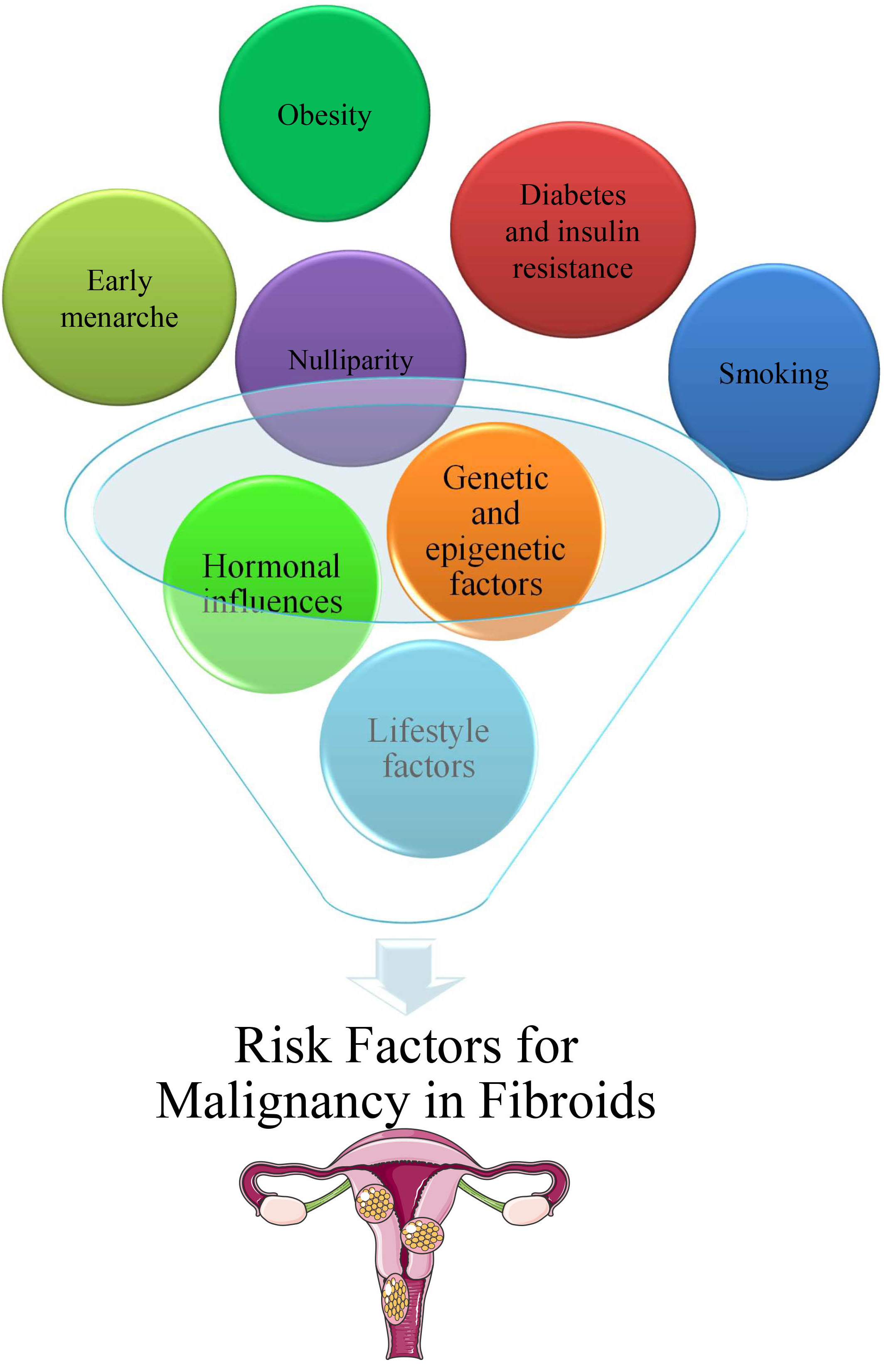 Uterine fibroids may increase or shrink in size due to hormonal shifts that occur during menopause and perimenopause, which are two stages of the aging process. With the changing uterine milieu that accompanies advancing maternal age, the risk of malignancies associated with fibroids increases [96]. The possible risk factors for malignancy in fibroids are shown in Fig. 3.