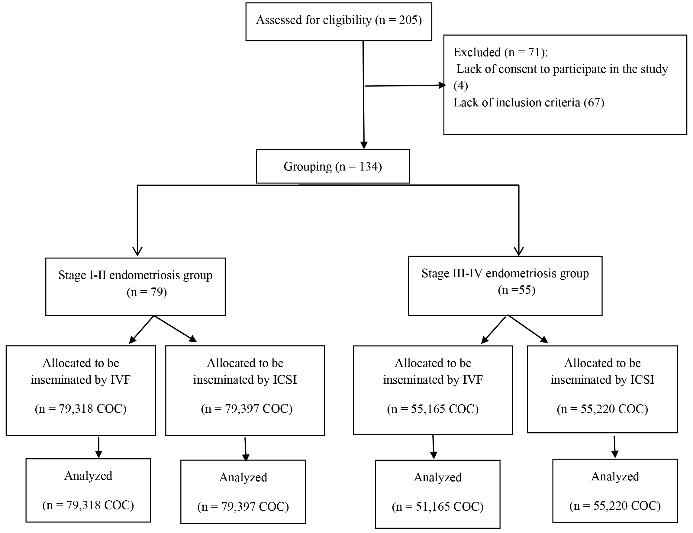 A total of 205 infertile patients with endometriosis, aged 18–39 years, undergoing IVF-ICSI treatment were initially recruited for the study. After screening, 71 women were excluded due to ineligibility, resulting in 134 patients being divided into two study groups. The first group consisted of 79 patients with stage I–II endometriosis, while the second group included 55 patients with stage III–IV endometriosis. Within each group, patients underwent assisted reproductive technology (ART) treatment, either through the insemination of sibling oocytes using IVF following short IVM or ICSI, utilizing normozoospermic samples. The exclusion criteria for the collected cases were: (i) age