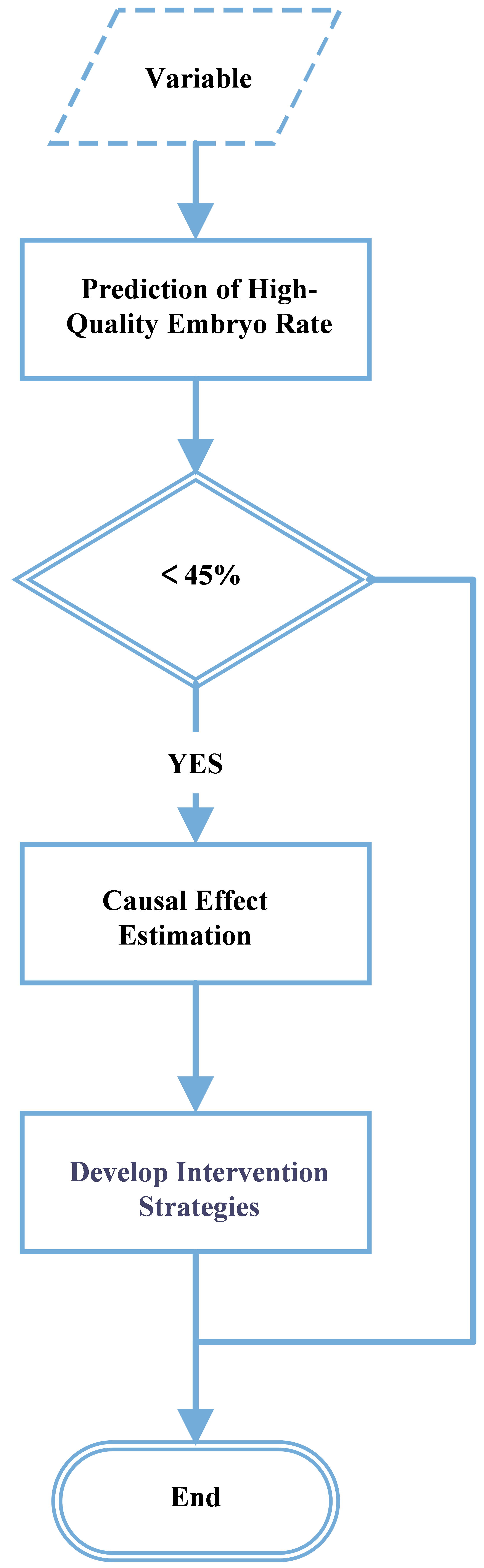 A retrospective analysis was performed using clinical data from 373 infertility couples who underwent IVF treatment, and the couples were grouped based on a high-quality embryo rate of ≥45% and <45% for statistical analysis. We developed an outcome prediction model and a causal effect estimation model to evaluate the impact of different intervention measures, based on the results of univariate logistic regression analysis.