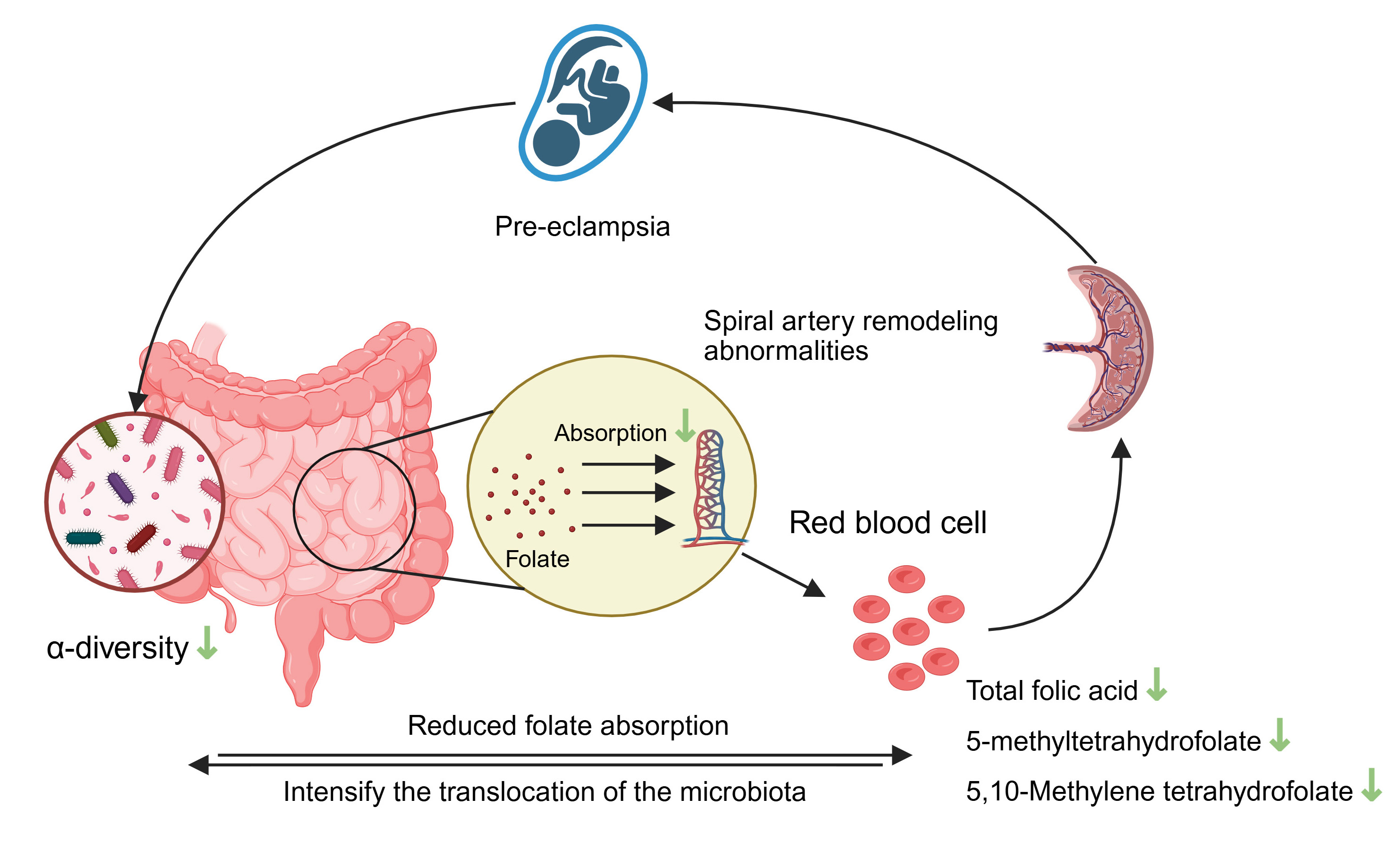 Our study has confirmed that patients with preeclampsia exhibit dual characteristics—red blood cell folate metabolic disorder and gut microbiota dysbiosis. A significant association exists between the 2 via the form of active folate. This finding has expanded our understanding of the pathological processes involved in preeclampsia, indicating that the gut microbiota can serve as a potential novel target for folate-based interventions. Interventions targeting the gut microbiota may improve folate metabolism and reduce the risk of preeclampsia.