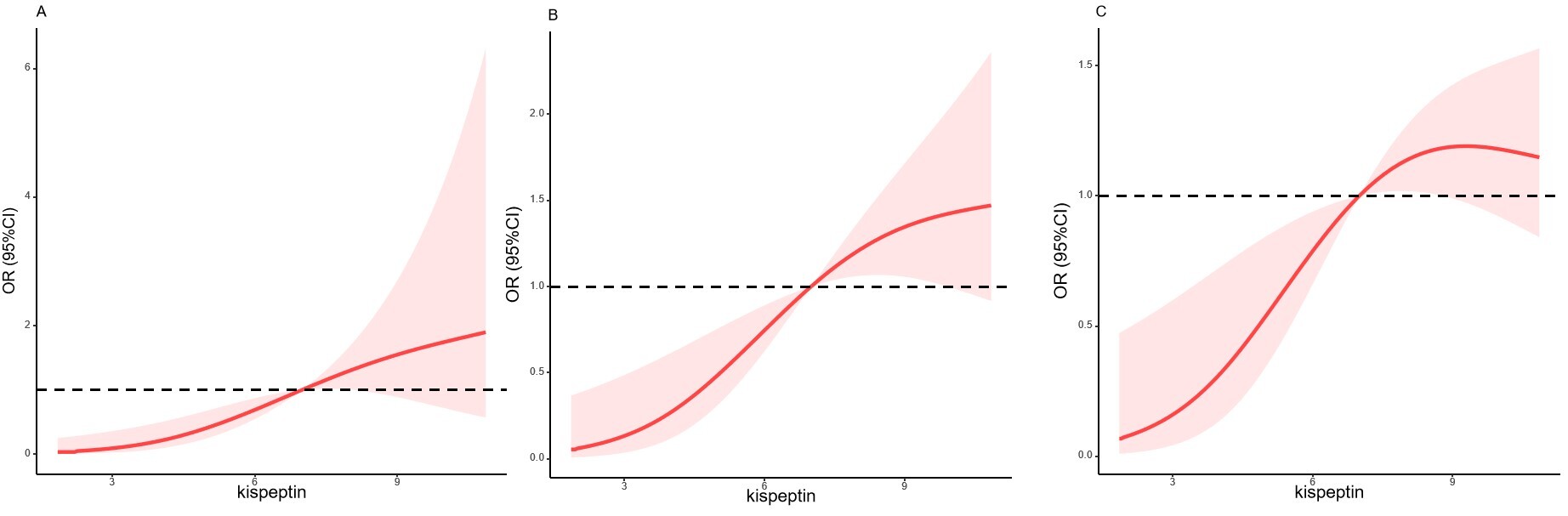 Cubic spline for the association between kisspeptin levels and pregnancy outcomes. (A) The pregnancy rate. (B) Clinical pregnancy rate. (C) Live birth rate. OR, odds ratio; CI, confidence interval.