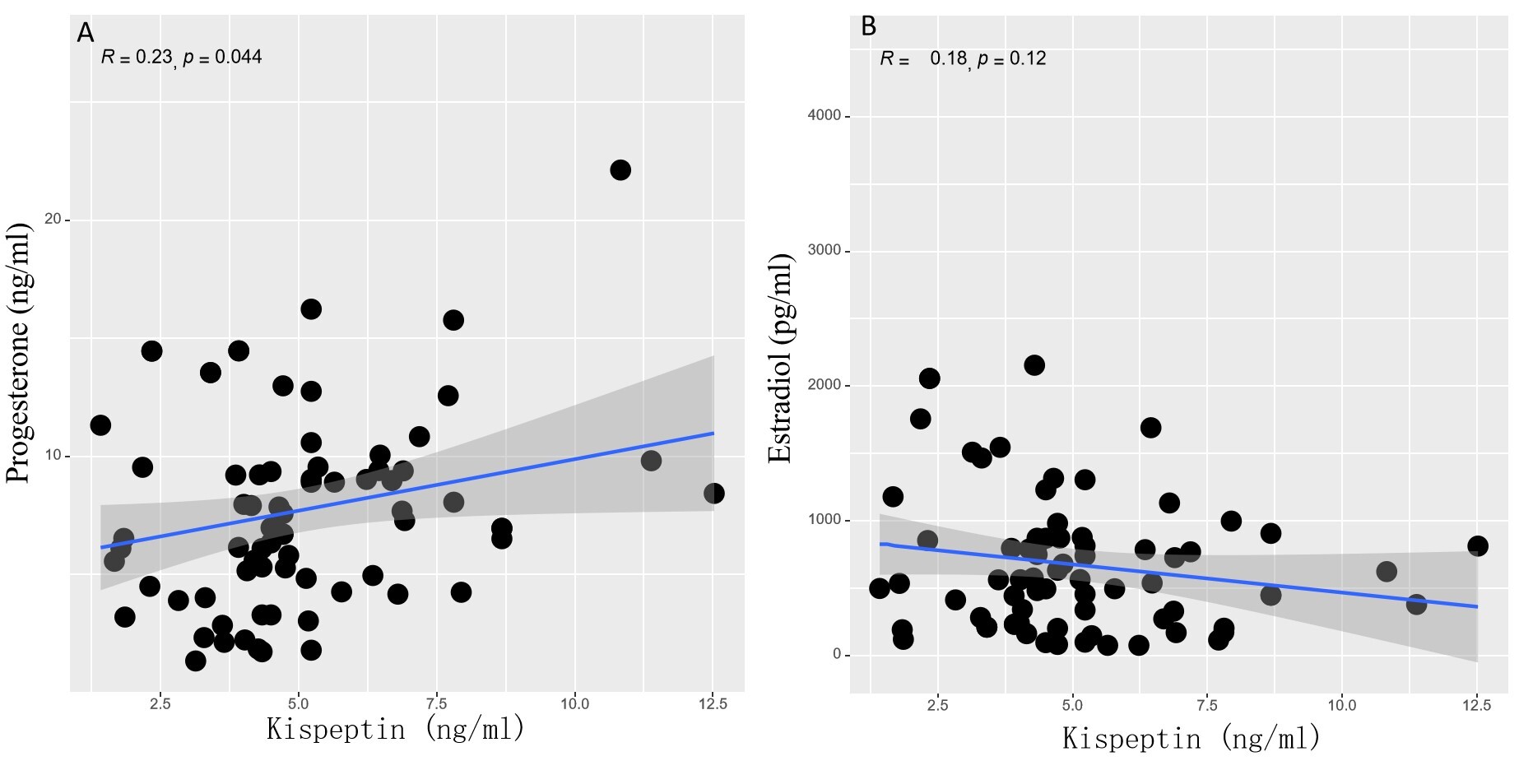 Association between kisspeptin levels and progesterone levels (A) or E2 levels (B) on the day of embryo transfer.