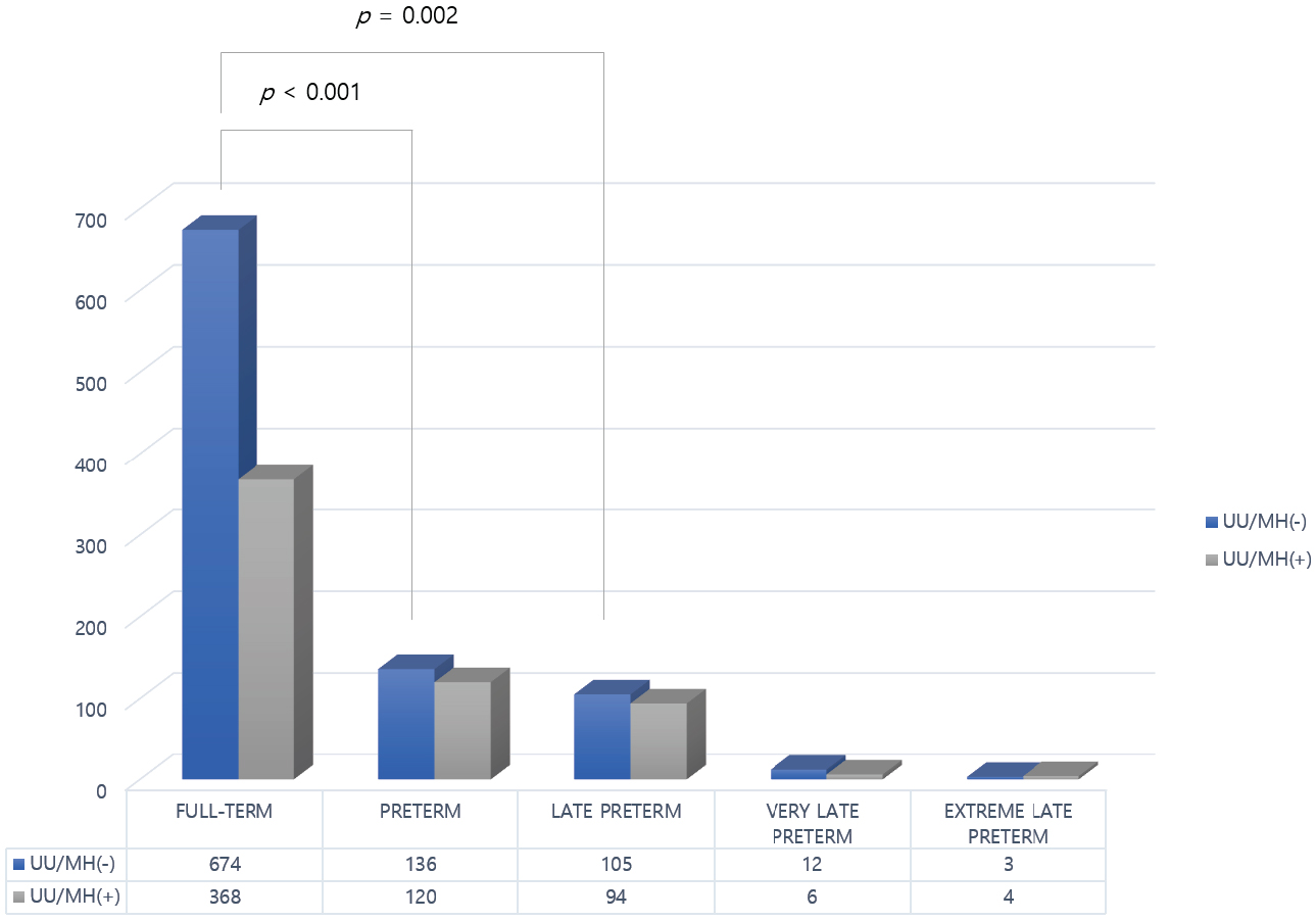 This single-center observational study reviewed electronic medical records of pregnant women who attended the obstetrics clinic at Gyeongsang National University Changwon Hospital between January 2017 and December 2020. We included patients with documented UU and MH test results. Both singleton and twin pregnancies were included, while patients without delivery records were excluded.