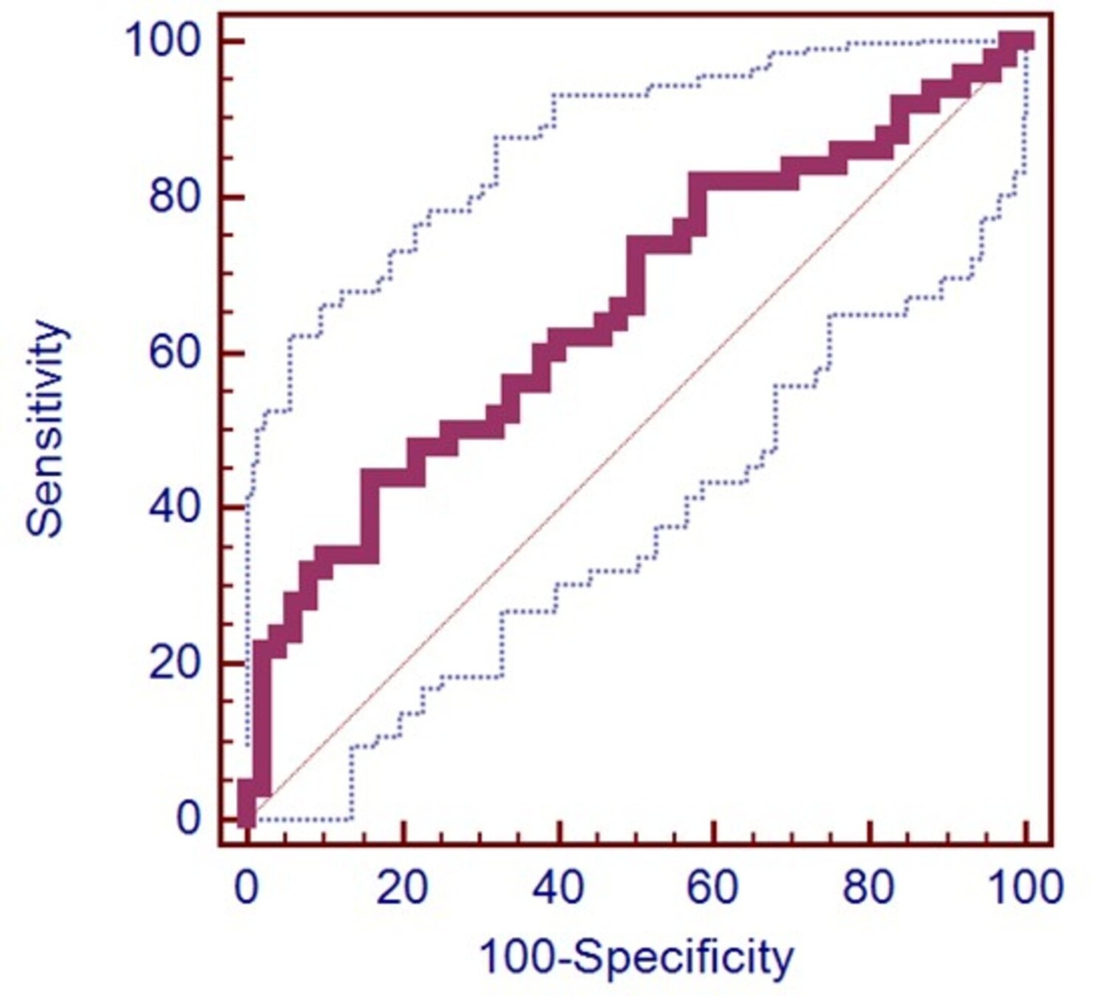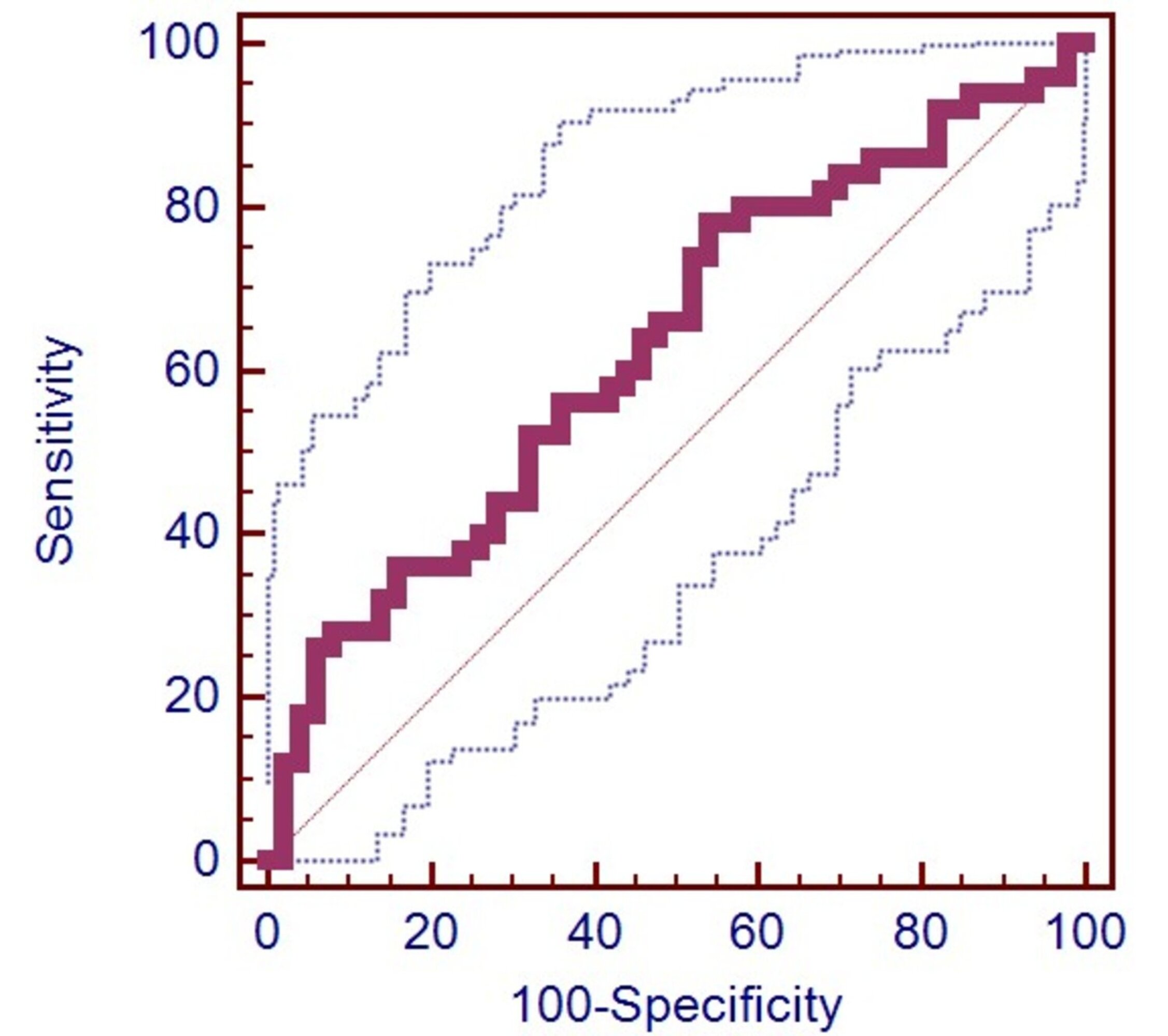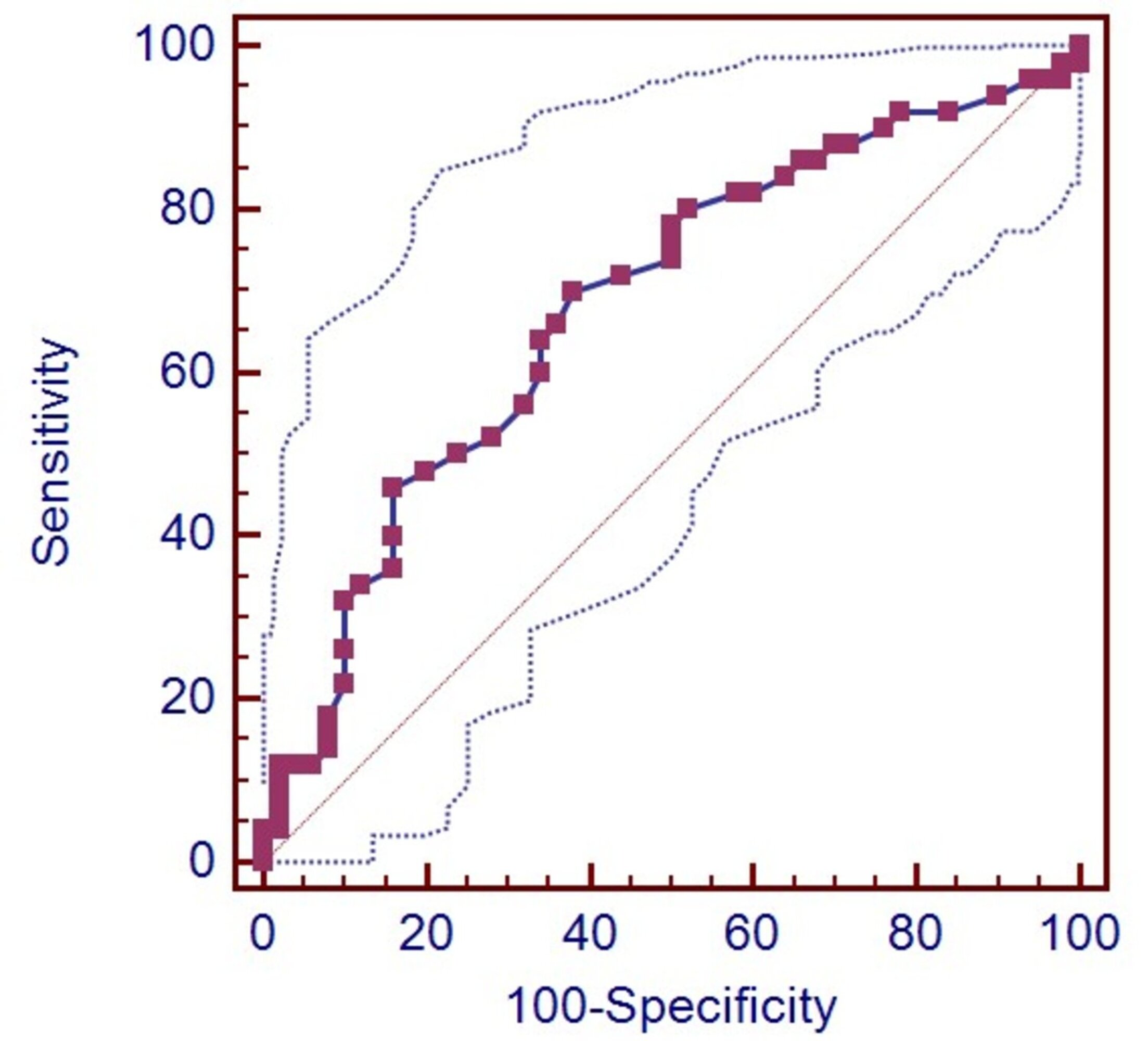Fig. 1. ROC Analysis of Pre- and Postoperative MLR Change in Infection Prediction (AUC = 0.656, p