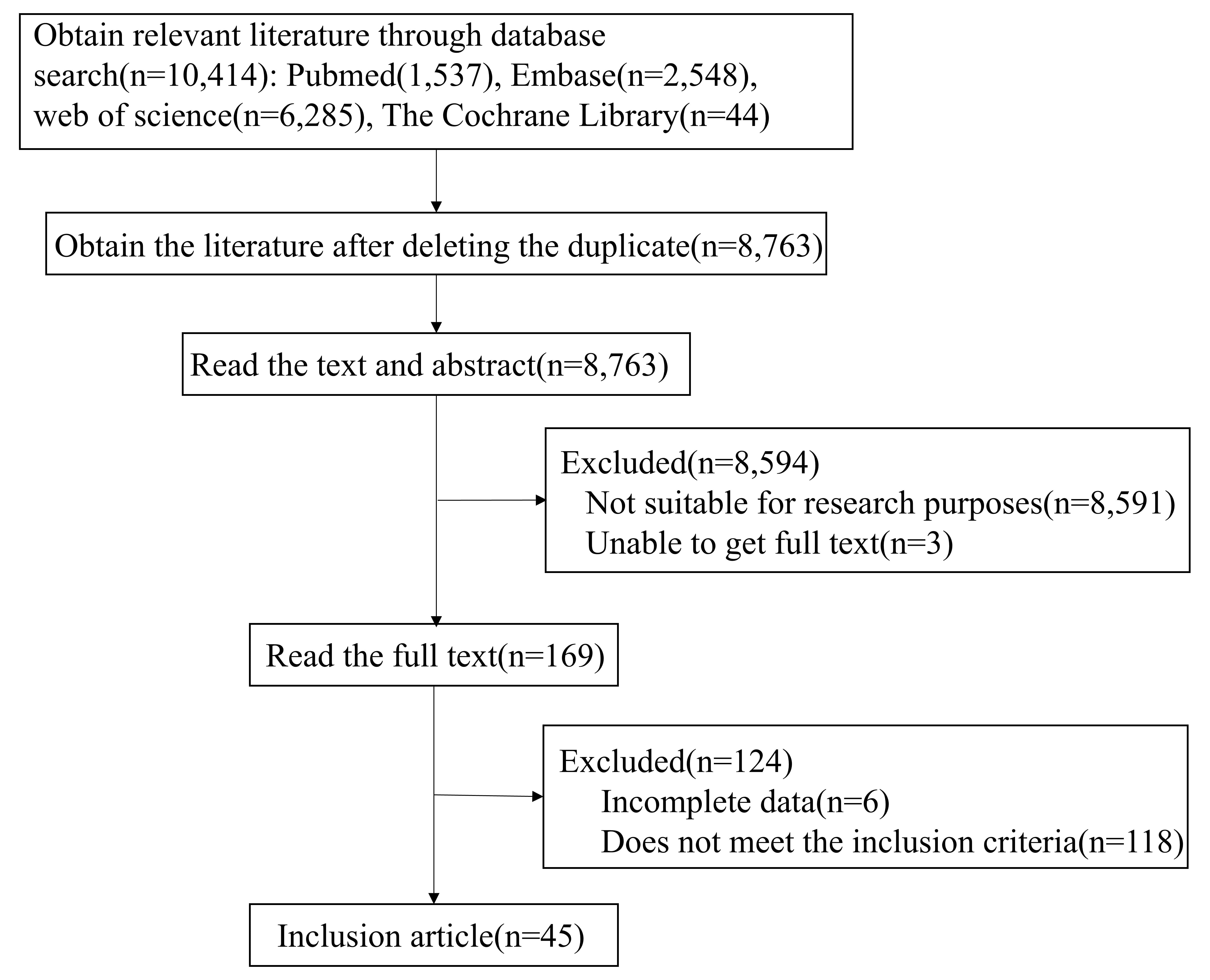We screened the PubMed, Web of Science, Cochrane Library, and Embase databases to identify relevant studies that had been published from inception to the 31st of July 2023. At the beginning of the study, we identified a total of 10,414 relevant articles based on the search strategy. After the two researchers independently read and screened the research data, a total of 44 studies [40, 41, 42, 43, 44, 45, 46, 47, 48, 49, 50, 51, 52, 53, 54, 55, 56, 57, 58, 59, 60, 61, 62, 63, 64, 65, 66, 67, 68, 69, 70, 71, 72, 73, 74, 75, 76, 77, 78, 79, 80, 81, 82, 83] were selected for the final investigation. The literature screening process and results are shown in Fig. 1.