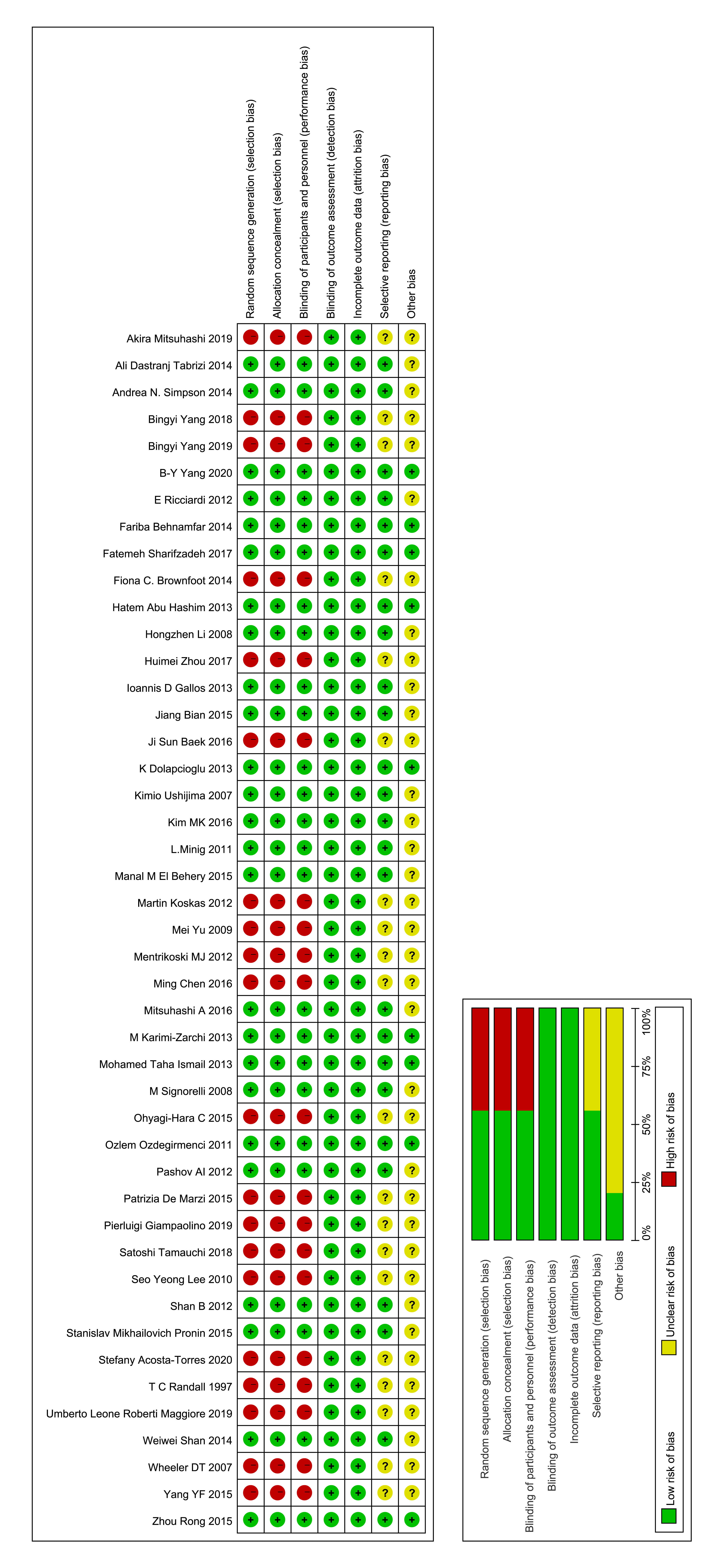 The basic features of the included studies are shown in Table 1 (Ref. [33, 40, 41, 42, 43, 44, 45, 46, 47, 48, 49, 50, 51, 52, 53, 54, 55, 56, 57, 58, 59, 60, 61, 62, 63, 64, 65, 66, 67, 68, 69, 70, 71, 72, 73, 74, 75, 76, 77, 78, 79, 80, 81, 82, 83]) while the oncological and reproductive outcomes in pre-menopausal EH women with or without atypical EH are shown in Table 2 (Ref. [33, 40, 41, 42, 43, 44, 45, 46, 47, 48, 49, 50, 51, 52, 53, 54, 55, 56, 57, 58, 59, 60, 61, 62, 63, 64, 65, 66, 67, 68, 69, 70, 71, 72, 73, 74, 75, 76, 77, 78, 79, 80, 81, 82, 83]). The quality of the literature was evaluated using the Cochrane risk of bias tool [39]; analysis showed that the main sources of potential bias were the blinding of subjects and intervention providers (Fig. 2). The included studies were published between 1997 and 2023. Nine of the studies were high quality RCTs [45, 47, 48, 50, 56, 60, 68, 69, 83].