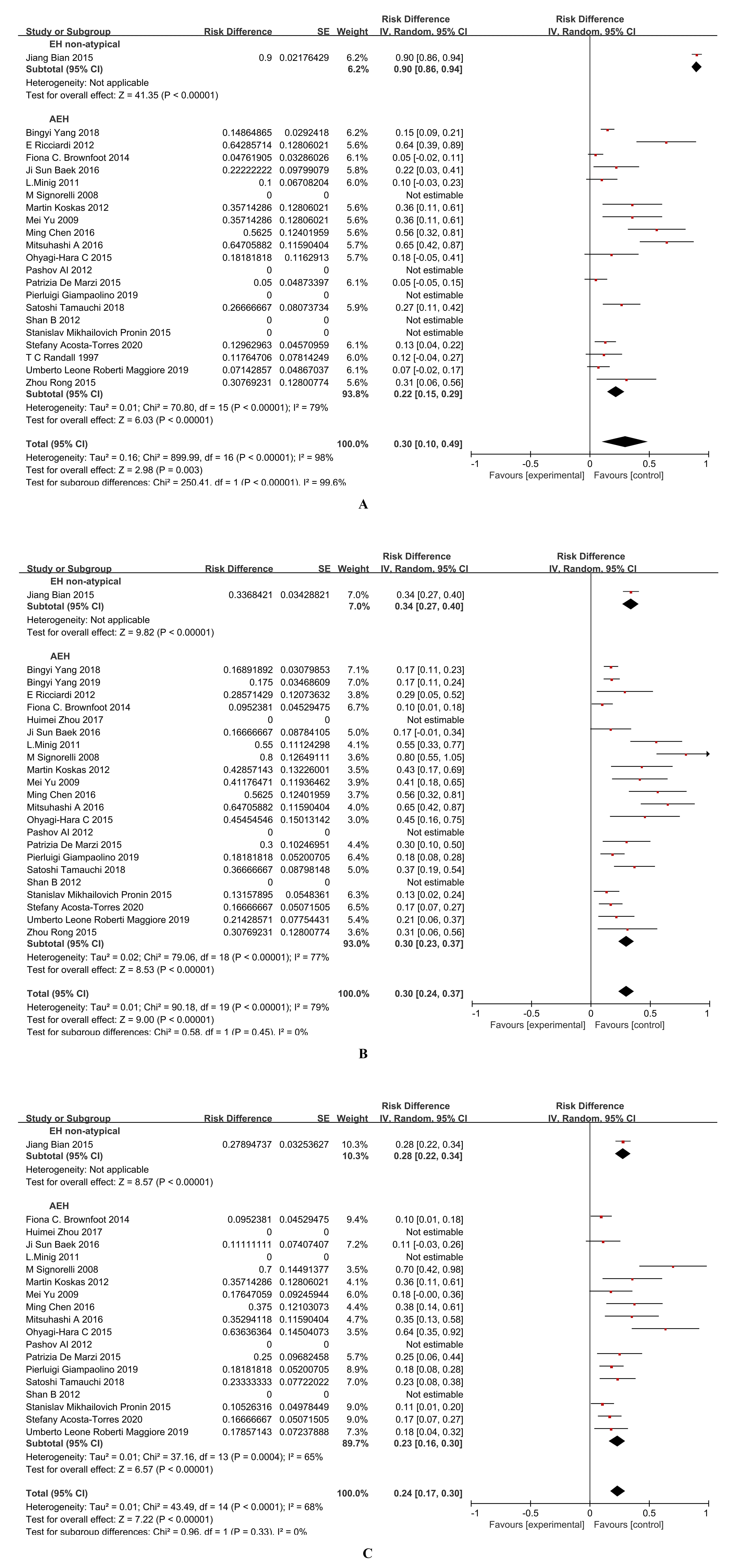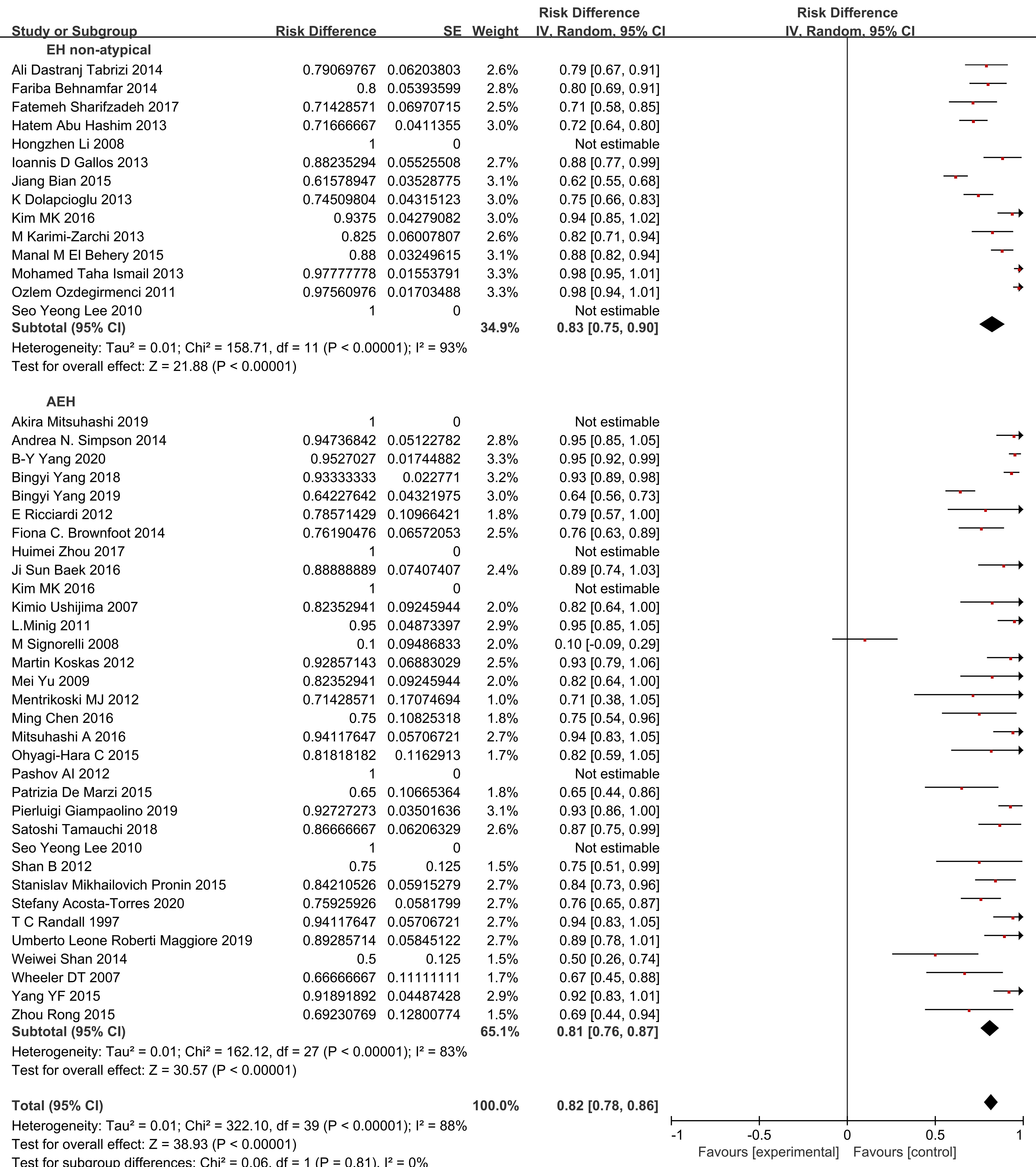 Fig. 3. Meta-analysis of complete response (CR) in women with endometrial hyperplasia with or without atypical hyperplasia (including subgroup analysis). EH, endometrial hyperplasia; AEH, atypical endometrial hyperplasia.