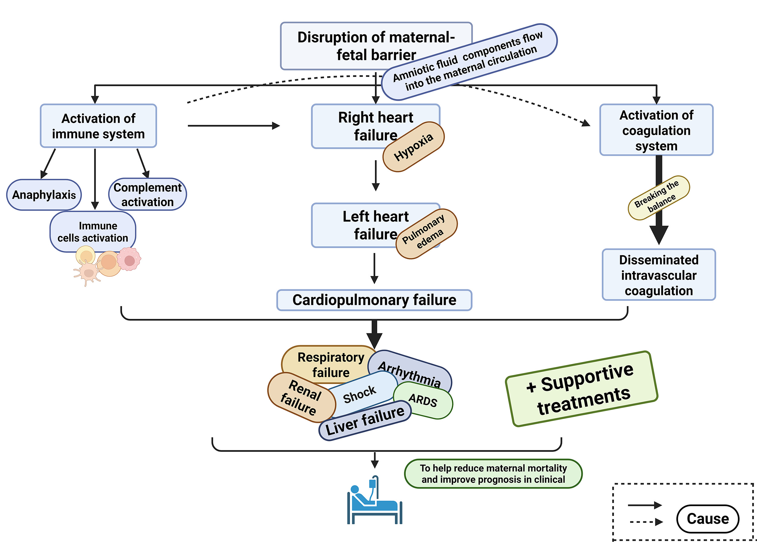 AFE is characterized by the sudden dysfunction of multiple organ systems, including immune system activation, cardiopulmonary collapse, and coagulation abnormalities such as DIC, all of which have been discussed in detail. However, the precise temporal and spatial relationships between these processes remain unclear. Most current studies on AFE are retrospective in nature, relying on the analysis of medical records, which limits their accuracy compared to controlled experimental research. The complexity of pathophysiology of AFE, combined with its rapid clinical progression, contributes to the current lack of targeted treatment strategies [68]. In this context, we have aimed to provide a comprehensive overview of the key factors involved in pathogenesis of AFE, integrating existing knowledge with previously discussed mechanisms. Overall, by deepening the understanding of these interconnected processes, our goal is to facilitate earlier clinical recognition, enhance patient outcomes, and ultimately reduce the maternal mortality associated with this devastating condition.