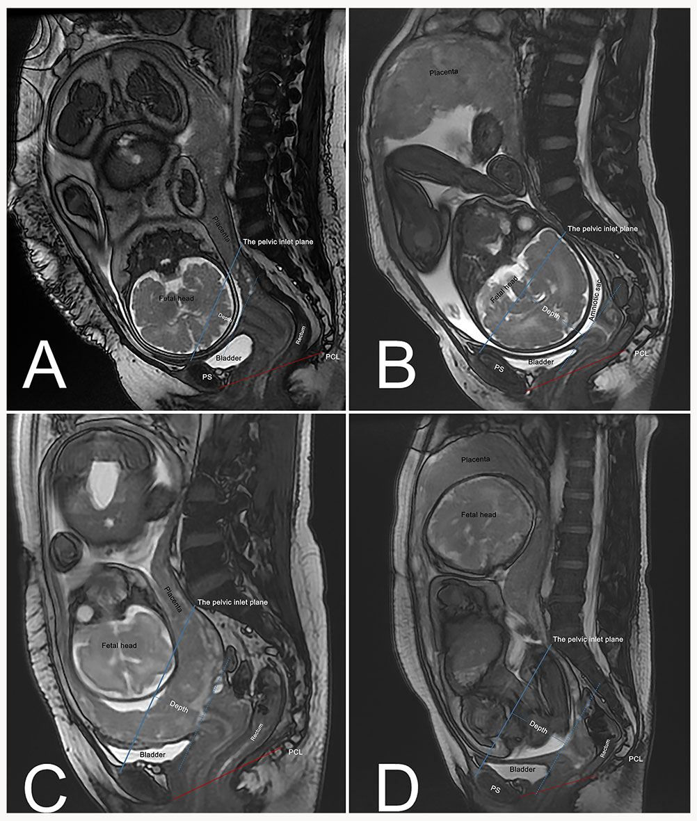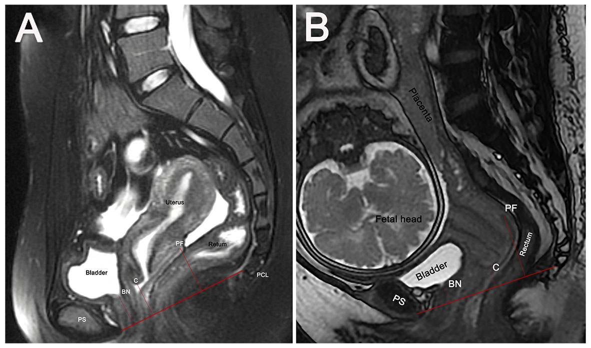In our two hospitals, pelvic MRIs were performed using a 1.5 Tesla magnet (Sigma, General Electric Medical System, Milwaukee, WI, USA) with patients in a lying position. The MRI measurements were performed on the (near-) midline sagittal plane by an experienced gynecologist-obstetrician and radiologist, using the Web-viewer (Version 1.0.0.53449, Greenlander Information Technology, Hangzhou, Zhejiang, China). Discrepancies were resolved through discussion. The sequences reviewed in this study were fat-saturated T2-weighted fast recovery fast spin-echo, T2-weighted single-shot fast spin-echo, or two-dimensional (2D) fast imaging employing the steady-state acquisition technique.