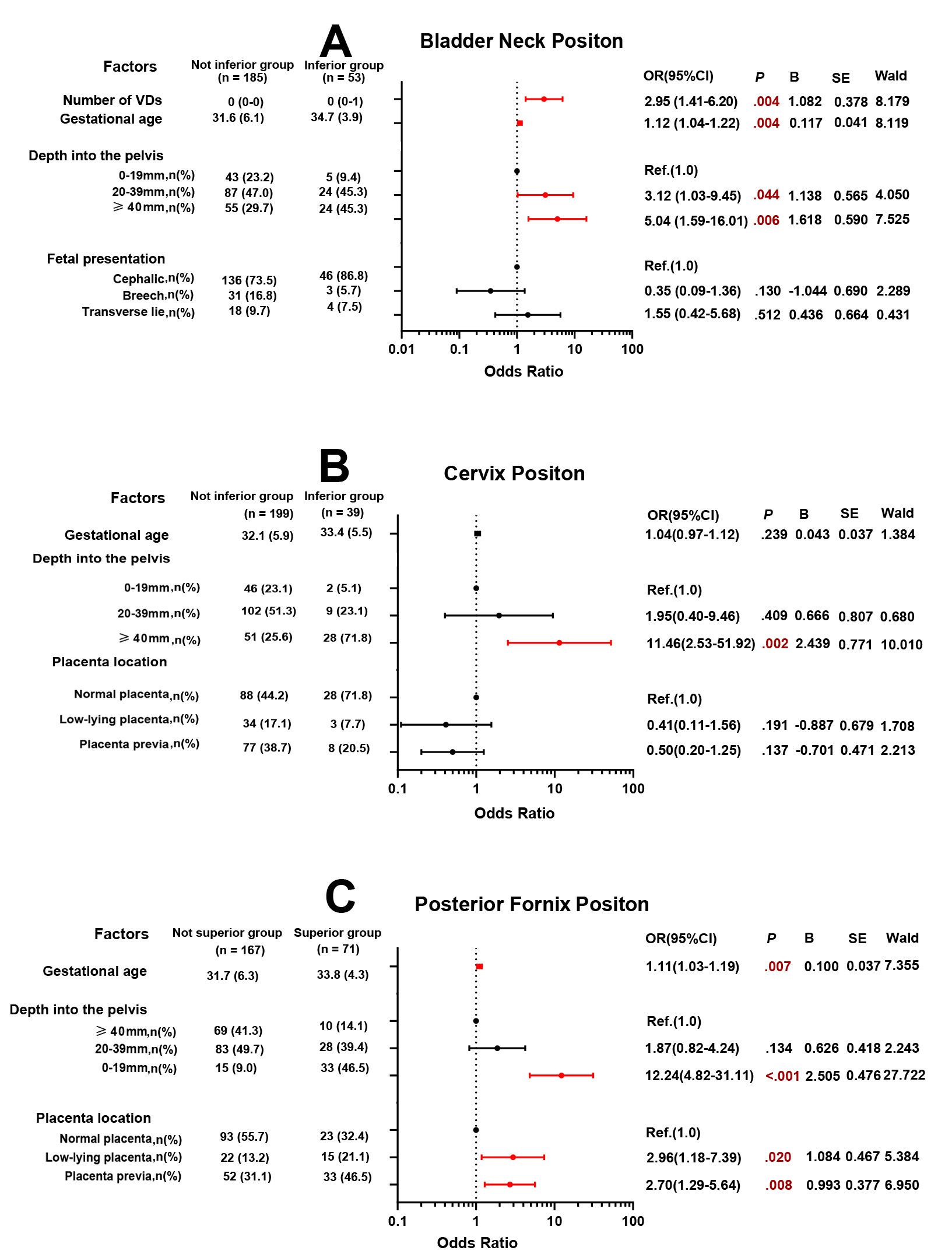 Univariate analysis found that a deeper depth of the fetus and its appendages in the pelvis was positively associated with an “inferior” C position; the presence of a low-lying placenta and placenta previa was inversely related (Supplementary Table 3). However, multivariate logistic regression (Fig. 3B) showed that an “inferior” C position occurred in 71.8% of women with a depth of the fetus and its appendages in the pelvis