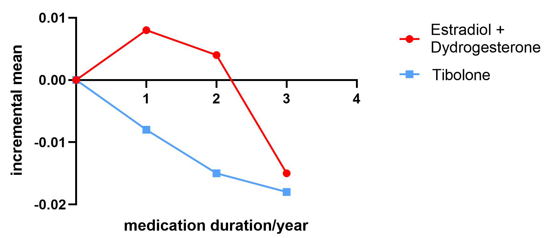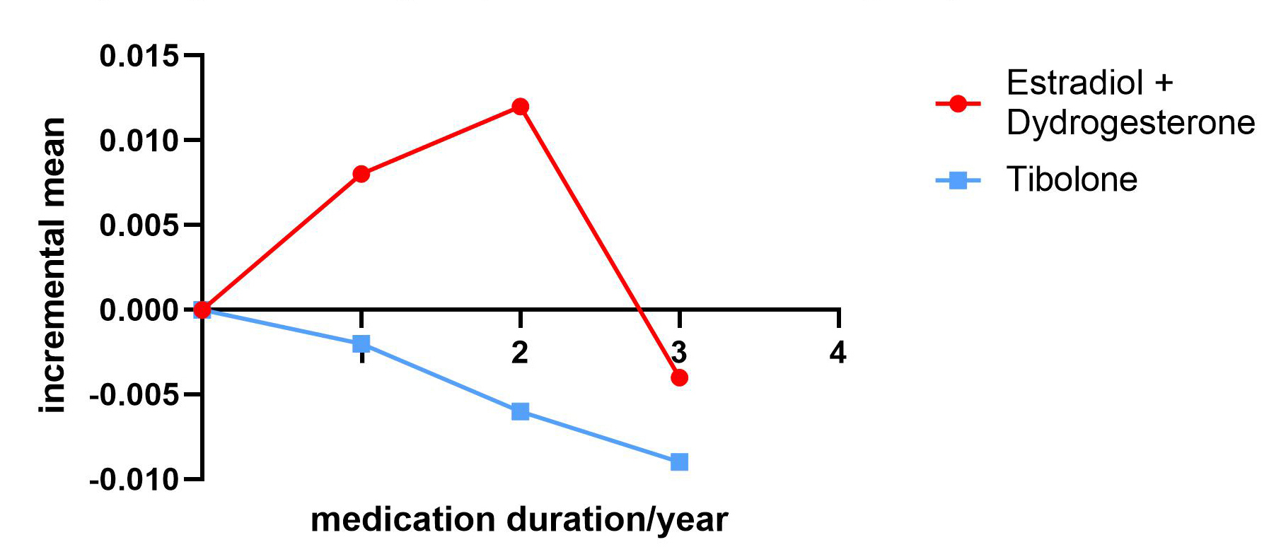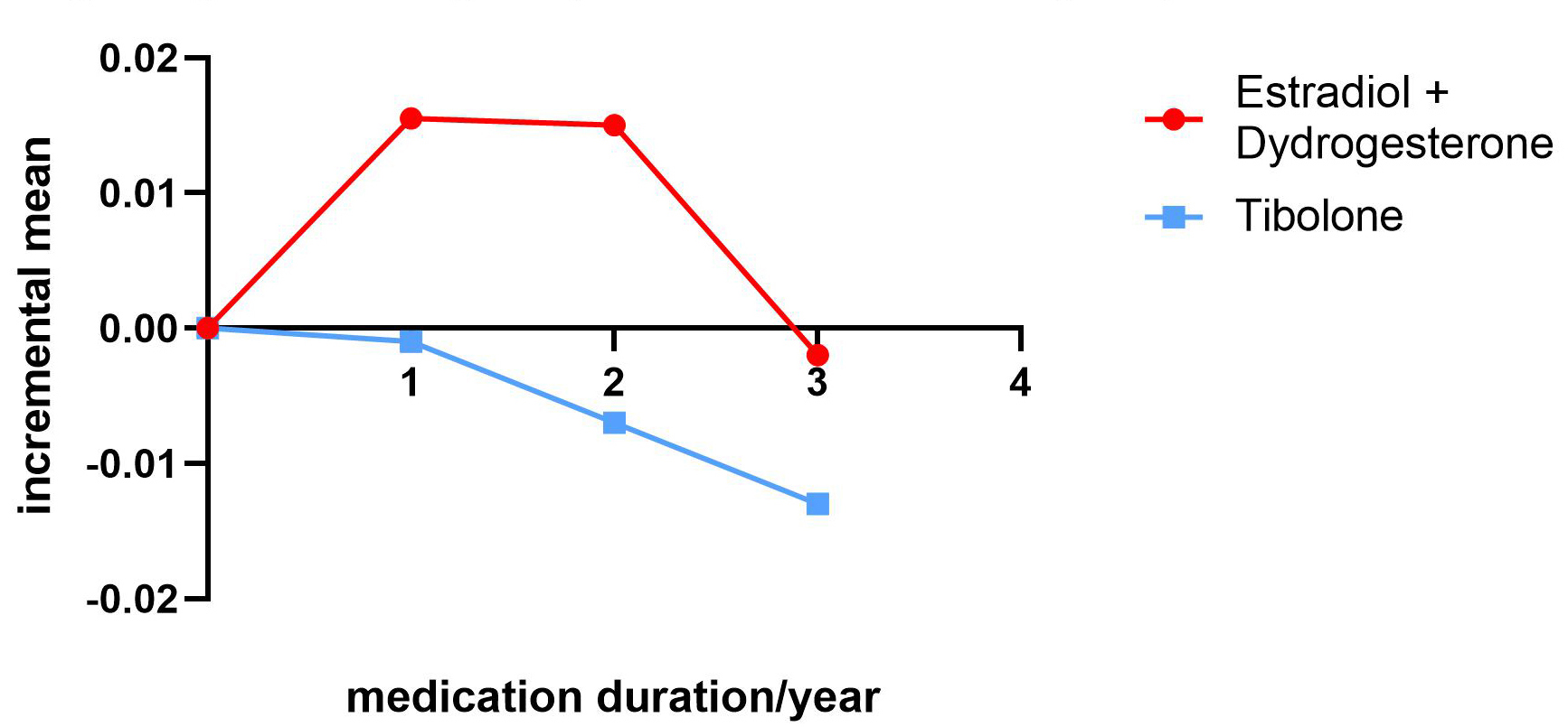 The use of estradiol plus dydrogesterone showed an increasing trend in the BMD of the lumbar spine, total hip, and femoral neck after 1 and 2 years of treatment, with a decrease in the third year. Tibolone treatment showed a decreasing trend in BMD after 1, 2, and 3 years, indicating that estradiol plus dydrogesterone is superior to tibolone in improving BMD. After 3 years of tibolone treatment, changes in BMD were correlated with age, height, weight, and body mass index (BMI), whereas after 3 years of estradiol plus dydrogesterone treatment, changes in BMD showed no significant correlation with age, height, weight, and BMI.