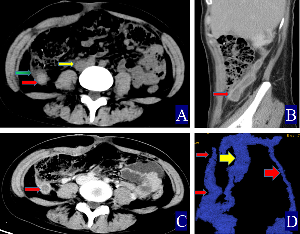 Fig. 1. A 24-year-old woman with right ovarian vein thrombophlebitis. The red arrow indicates the ovarian vein, the yellow arrow indicates the inferior vena cava, and the green arrow indicates the periovarian vein exudate. (A) Non-contrast axial CT image. The right OV is approximately 1.4 cm wide (CT value = 52.00 HU, red arrow). The inferior vena cava shows a CT value of 32.40 HU (yellow arrow), with visible surrounding exudation (green arrow). (B) Contrast-enhanced sagittal CT image. A filling defect is observed in the right ovarian vein, consistent with POVT, and the vessel wall appears uniformly thickened (red arrow). (C) Contrast-enhanced axial CT image. The right ovarian vein shows a clear filling defect, and the vessel wall is uniformly thickened (red arrow). (D) Three-dimensional vein reconstruction. The inferior vena cava is marked (yellow arrow), with the right OV shown as a thin red arrow and the left OV as a thick red arrow.