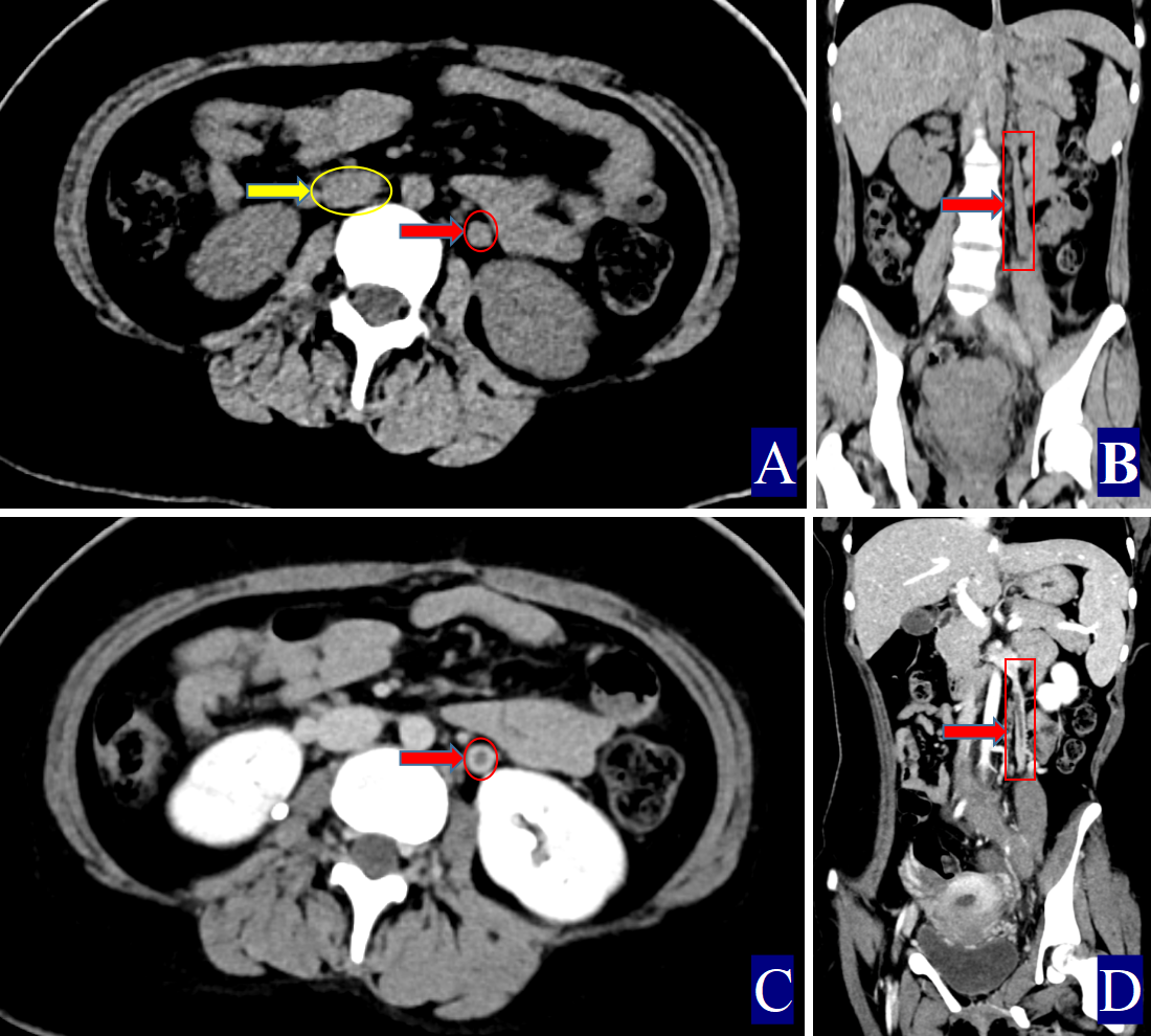 Fig. 2. A 17-year-old woman with left ovarian vein thrombophlebitis. The red color (red circle, red arrow and red cuboid) indicates the ovarian vein, the yellow color (yellow circle and yellow arrow) indicates the inferior vena cava. (A) Non-contrast axial CT image. The right OV measures approximately 0.91 cm in width (CT value = 46.10 HU, red arrow). The CT value of the inferior vena cava is 32.00 HU (yellow arrow). (B) Non-contrast coronal CT image showing the left OV (red arrow). (C) Contrast-enhanced axial CT image. Thrombosis in the left OV with uniform wall thickening (red arrow). (D) Contrast-enhanced coronal CT image. Left POVT with uniformly thickened wall (red arrow).