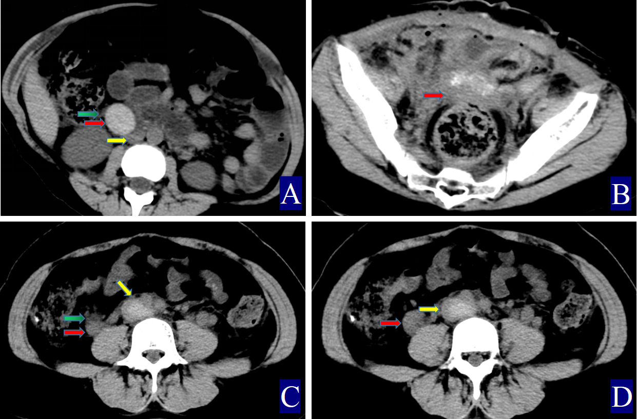 Fig. 3. The primary and secondary CT findings of ovarian vein thrombophlebitis. The red arrow indicates the ovarian vein, the yellow arrow indicates the inferior vena cava, and the green arrow indicates the periovarian vein exudate. (A) Non-contrast axial CT image. The right ovarian vein is approximately 2.92 cm wide (CT value = 63.50 HU, red arrow). The CT value of the inferior vena cava is 38.40 HU (yellow arrow), with adjacent exudation (green arrow). (B) Non-contrast axial CT image showing pelvic effusion (thick red arrow). (C,D) A 21-year-old woman with right ovarian vein thrombophlebitis and inferior vena cava thrombosi: (C) Non-contrast axial CT image. The right ovarian vein is about 1.6 cm wide (CT value = 59.30 HU, red arrow). The inferior vena cava shows a CT value of 71.80 HU (yellow arrow), and surrounding exudation is noted (green arrow). (D) Non-contrast axial CT image.