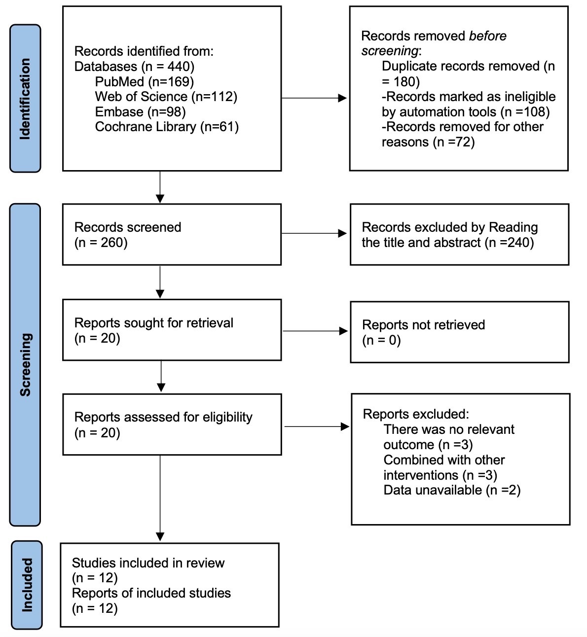 A total of 440 articles were initially identified. After a step-by-step screening process, 12 RCTs [11, 12, 13, 14, 15, 16, 17, 18, 19, 20, 21, 22] were ultimately included, involving a total of 1184 patients. The literature screening process and results are shown in Fig. 1.